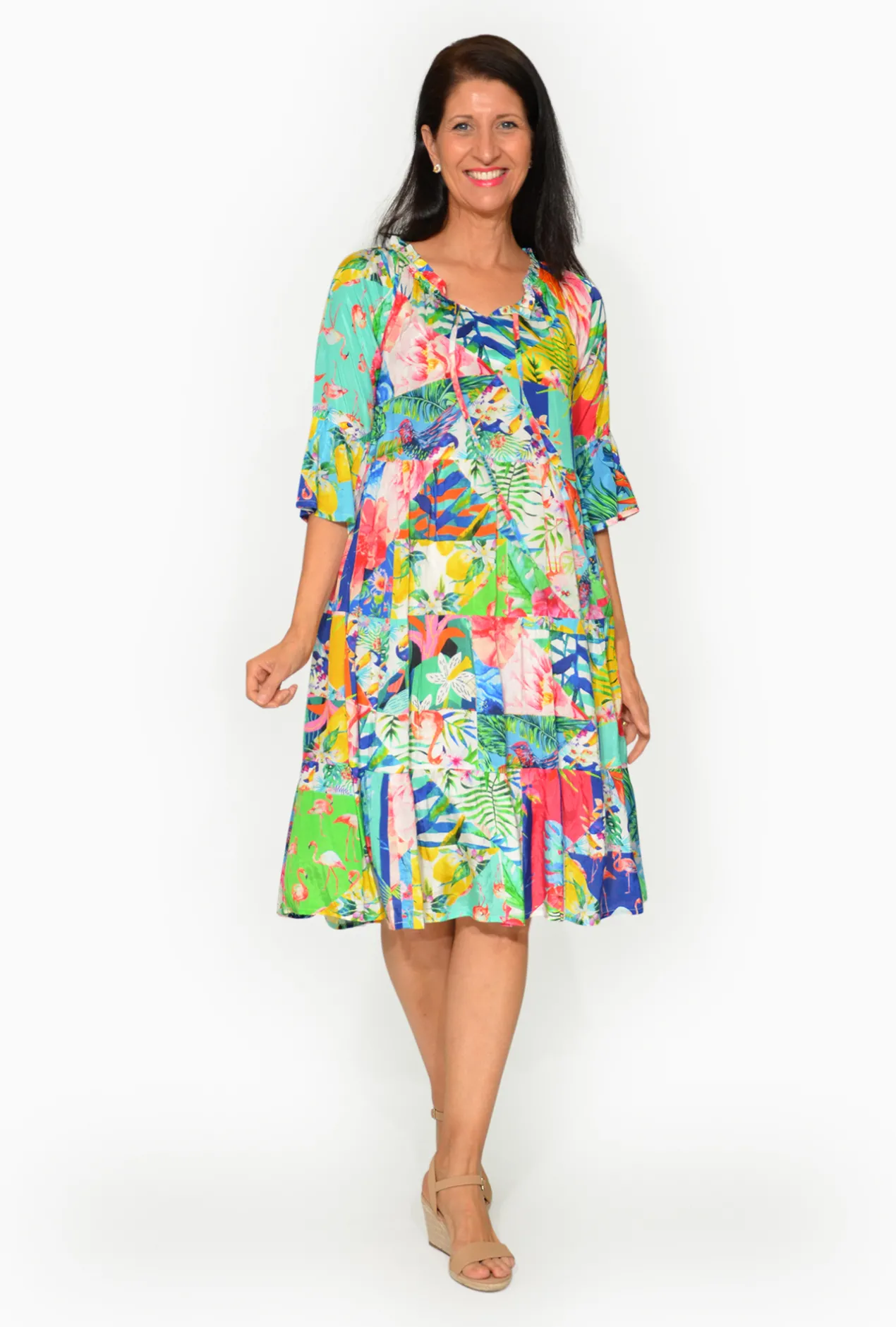 Adorned with playful tassel details at the neckline and gathered seams at the bust, it effortlessly flows into a tiered skirt for a flattering and comfortable fit. The bold mix of colourful prints adds a unique touch, making this dress a must-have for all your warm-weather adventures. Perfect for beach outings, picnics or casual brunches, this dress will be your go-to favorite all summer long!
