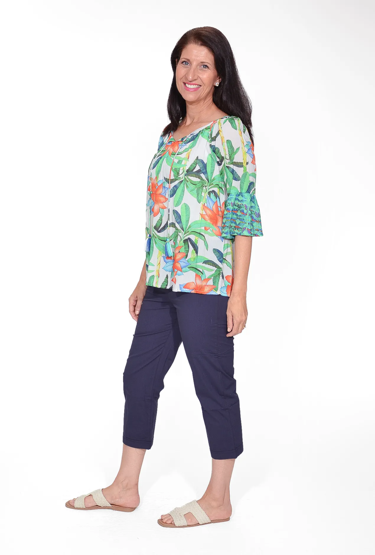 This effortlessly chic piece features an open neckline adorned with playful tassel details and three-quarter flared sleeves. The vibrant Colours and bold floral prints create a lively, eye-catching look, while the relaxed silhouette ensures comfort and ease. Ideal for a day by the sea, pair it with the Thalia Pant for a coordinated, stylish beach outfit.