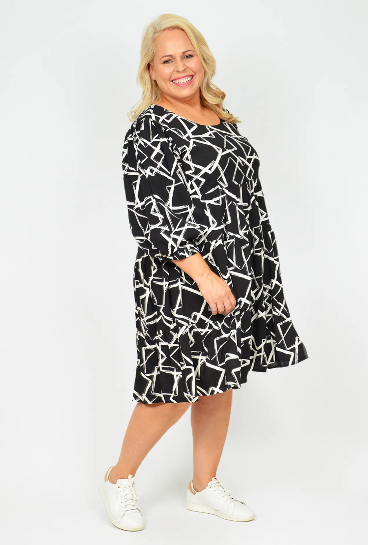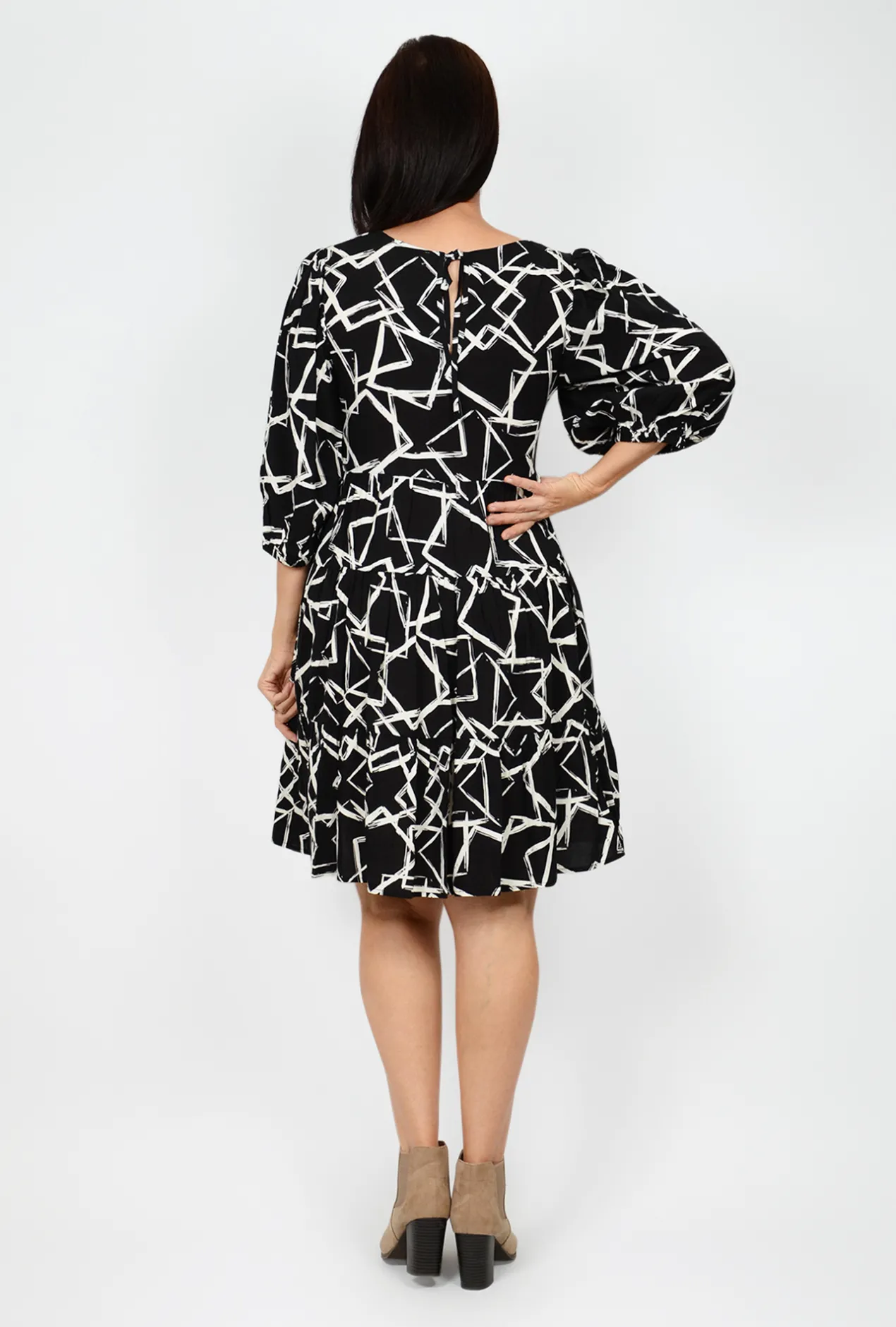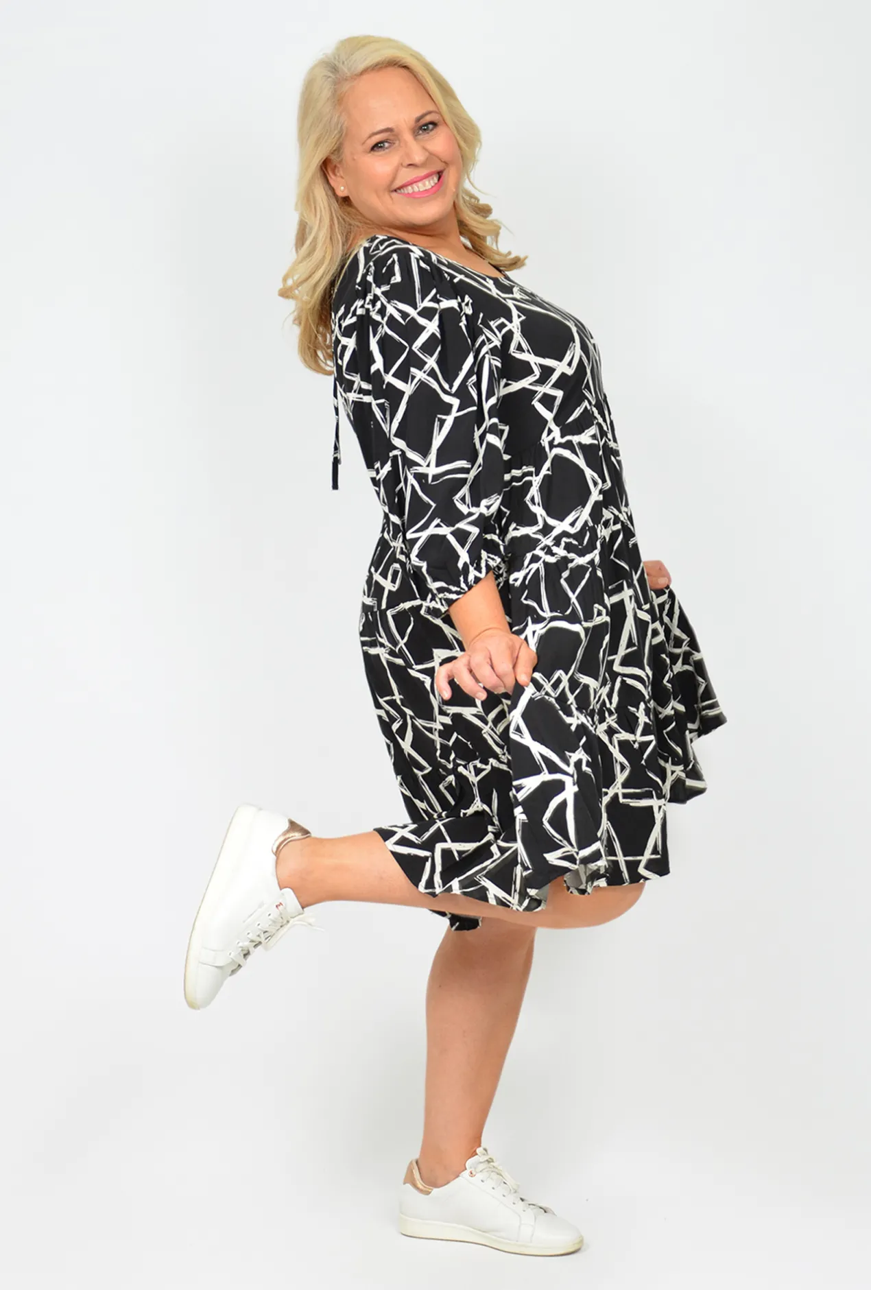 Effortlessly chic, the Esme 3/4 sleeve Short Smock Dress from Fira is a must have style this winter. 100% rayon, this loose smock design features gorgeous 3/4 bell sleeves and a tie key hole detail at the back. When wearing this style, glamour and cool are the words that come to mind. Winter-fy the Esme 3/4 sleeve Short Smock Dress with stockings, black boots and a jacket.
