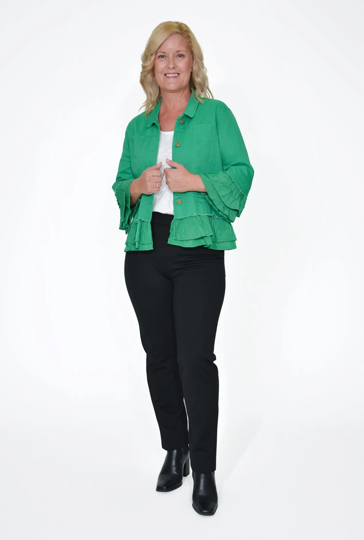 Comfortable? Chic? Effortless? Mila 3/4 Frill Sleeve Jacket in Green covers them all!