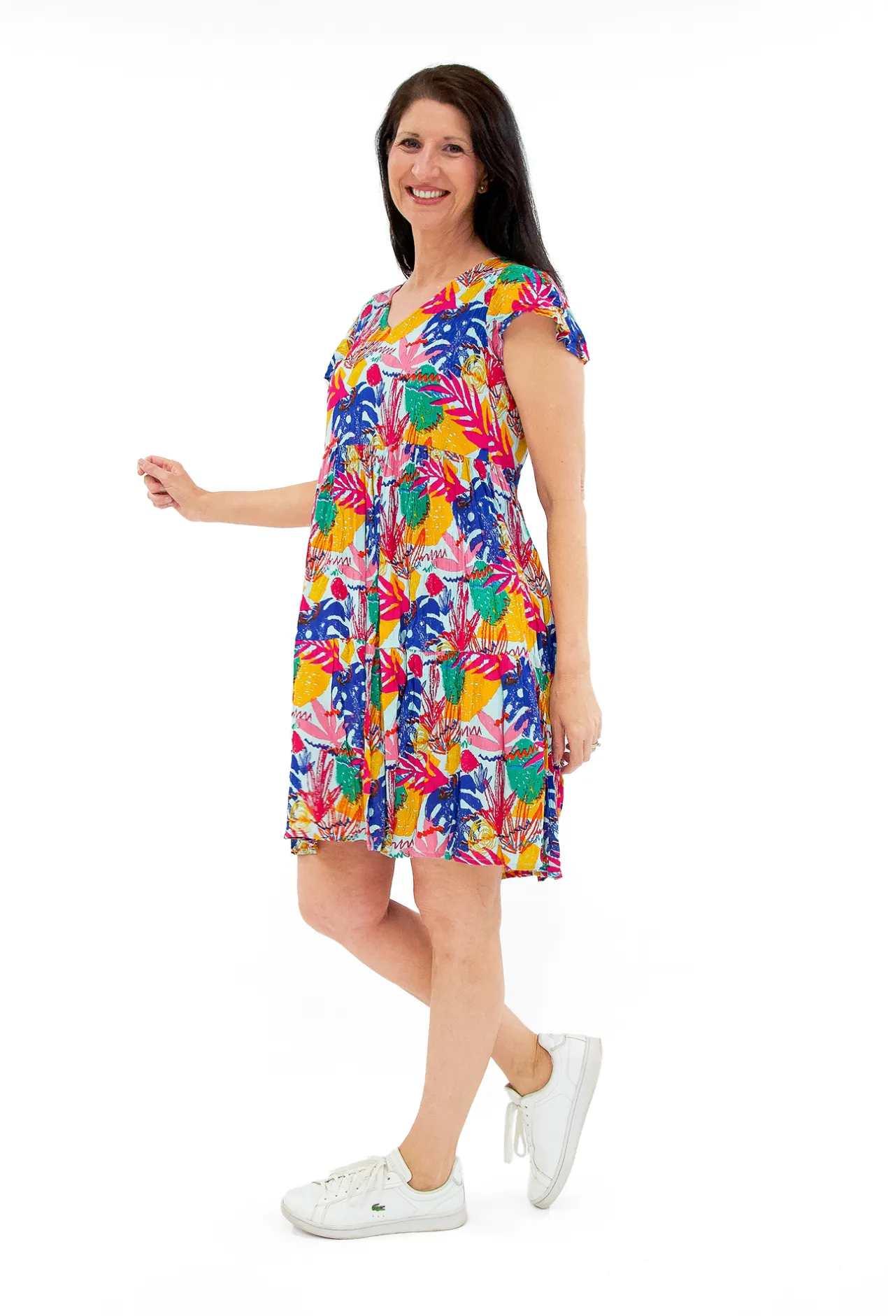The Chloe dress showcases short sleeves with delicate flutter edges and a graceful V-neckline, creating an enchanting look. The tiered layers add movement and flair, while the stunning pink print evokes serenity and style. Crafted with meticulous attention to detail, this dress offers both a fashionable appearance and a comfortable fit.