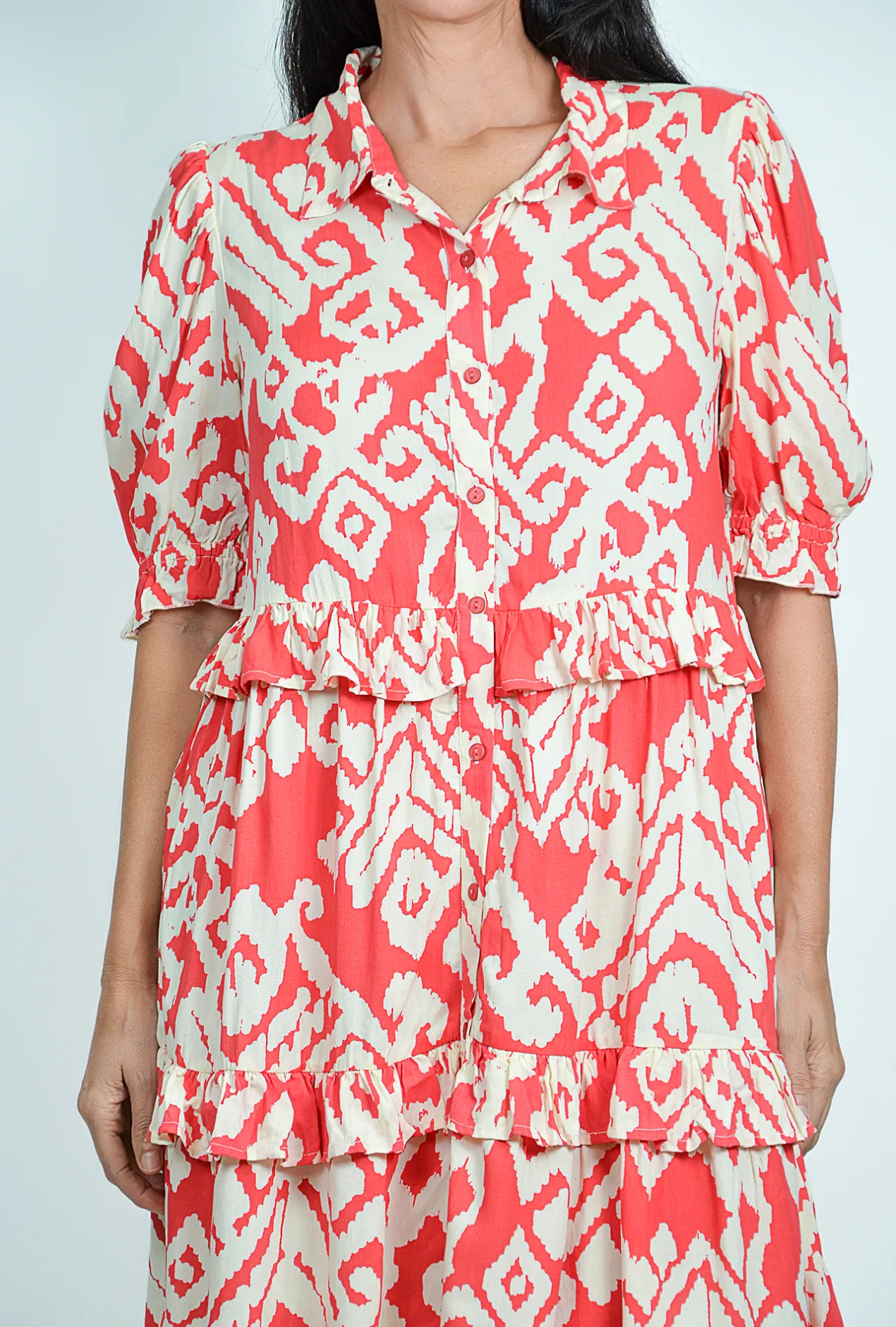 Raise a glass with your besties in our Eloise Puff Sleeve Button Up Dress in Coral!