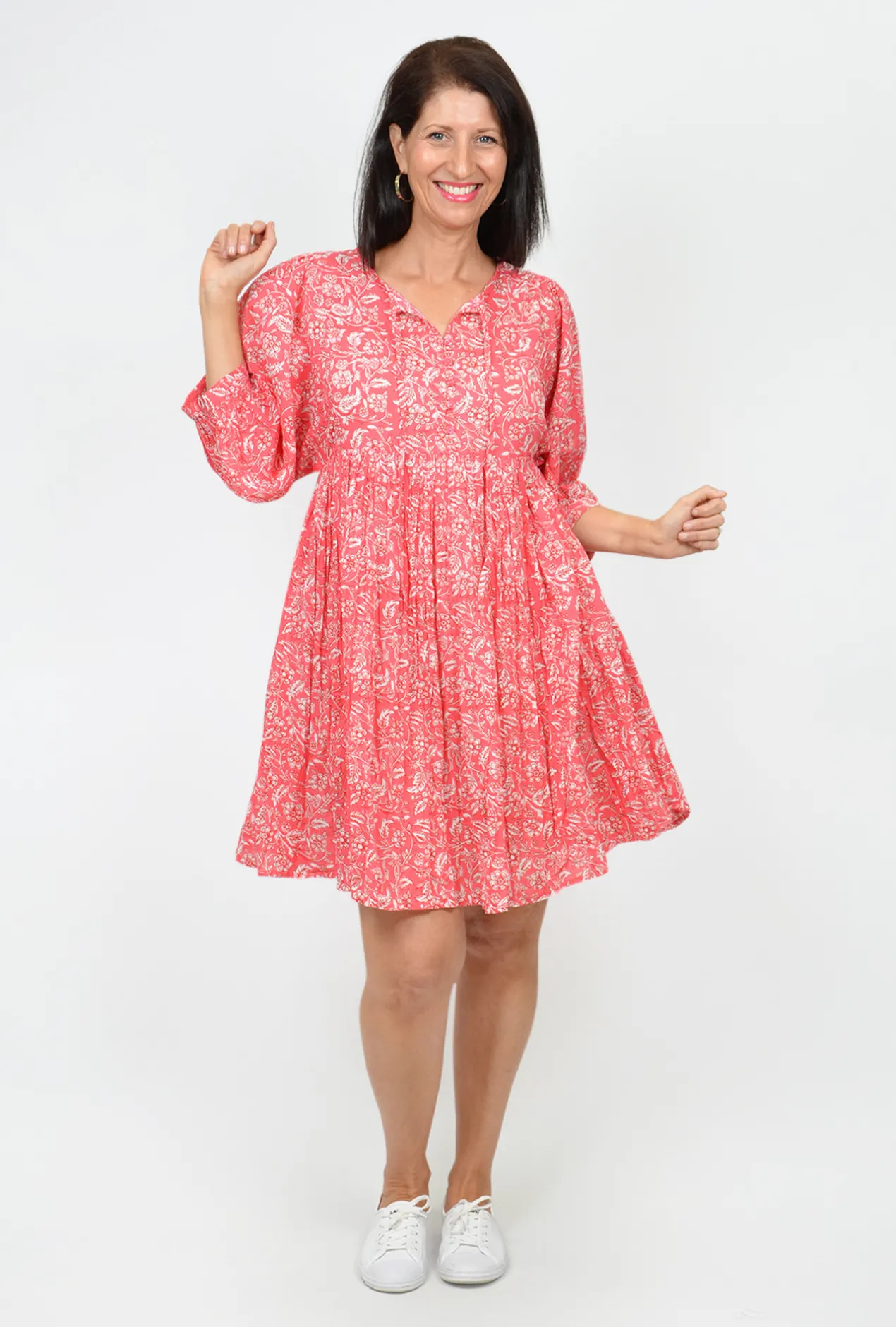 Fall in love with our heavenly Genevieve Boho 3/4 Sleeve Cotton Dress in Coral. A dreamy red/orange block printed crinkle cotton featuring gorgeous 3/4 billowed sleeves and a romantic airy silhouette, the Genevieve style can be worn over the swimmers at the beach or, which the right accessories, into the night. The front tie can be worn done up or open for a more relaxed feel.