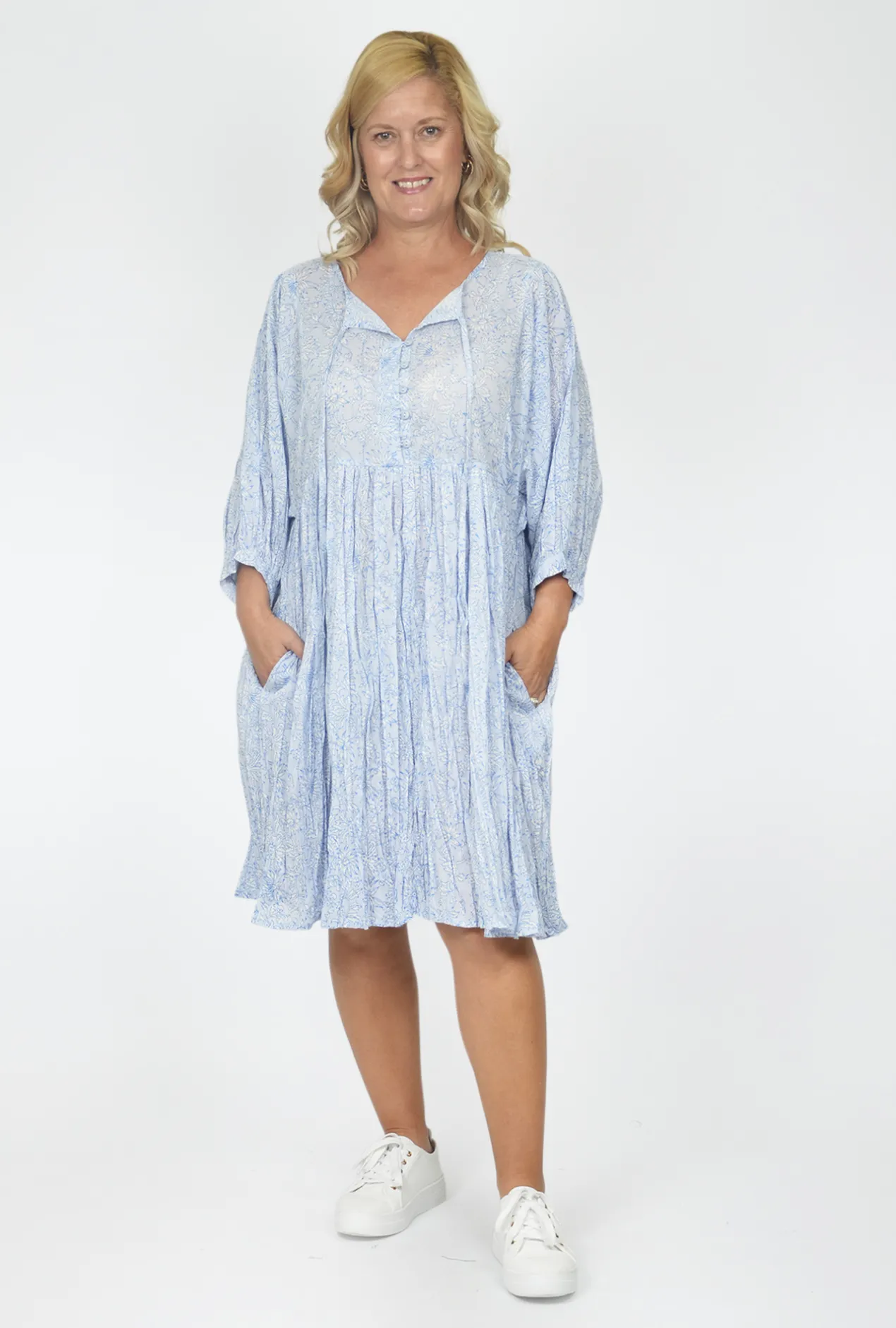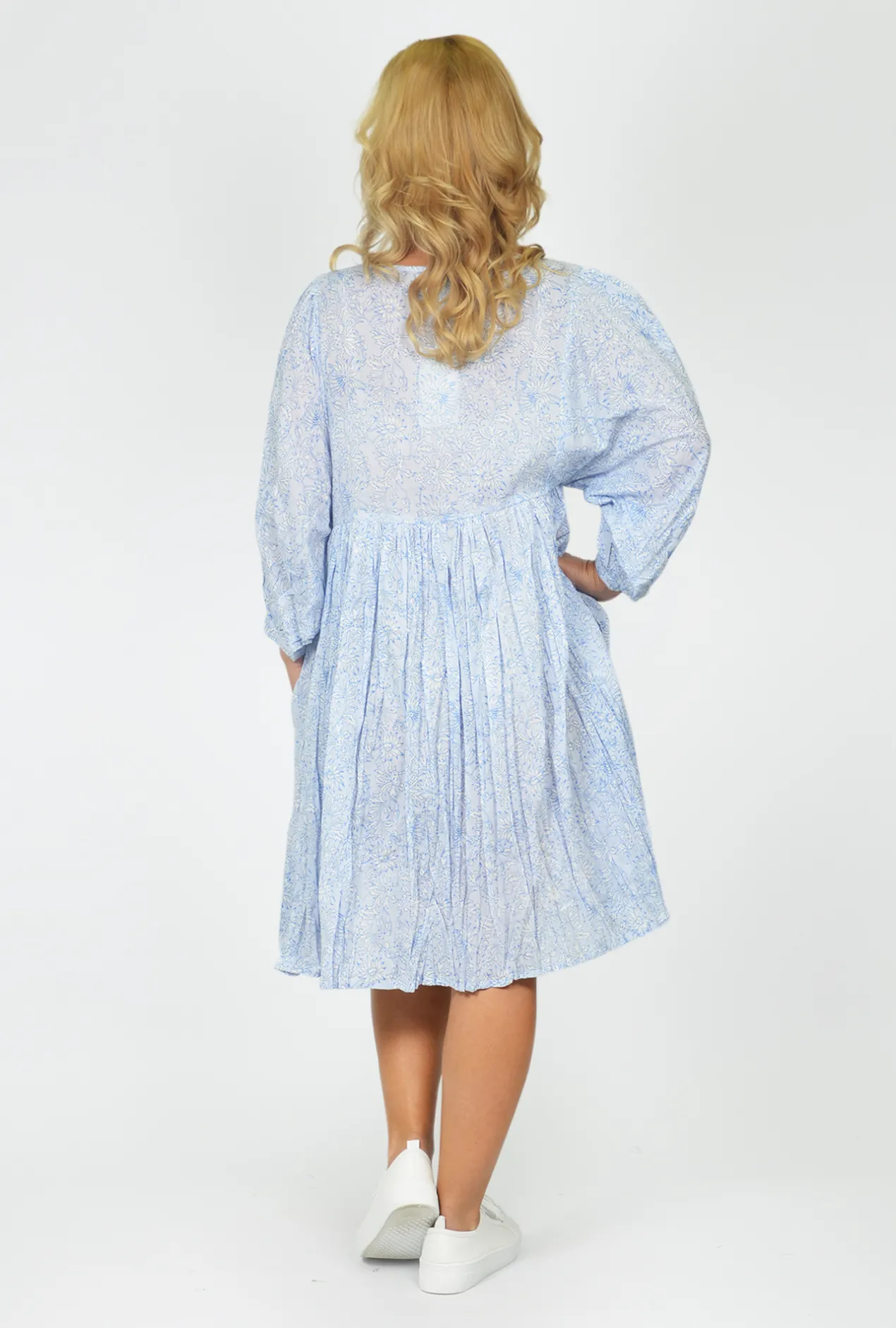 Our Genevieve Cotton Dress in Sky Blue combines style, comfort, and functionality in one stunning garment.