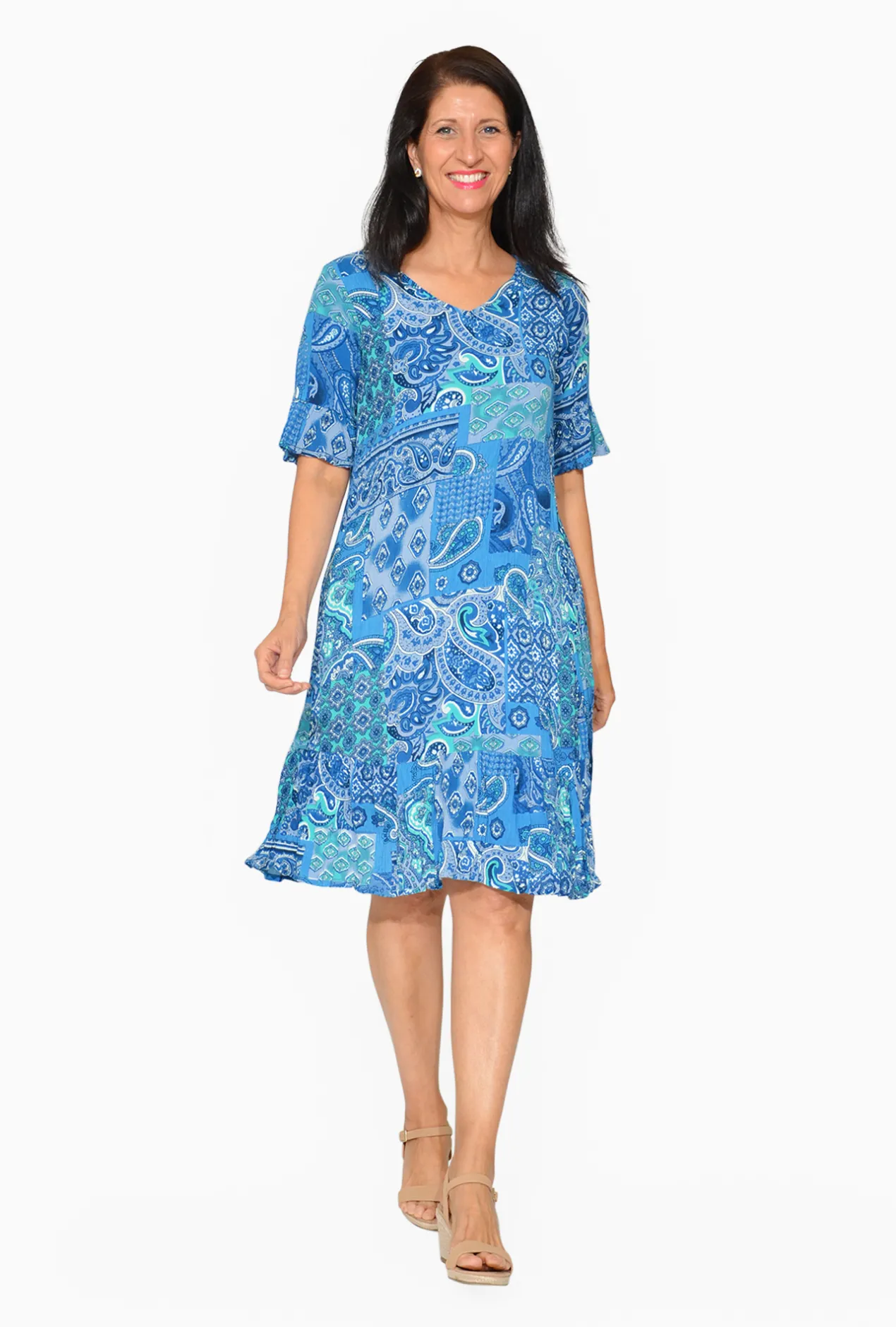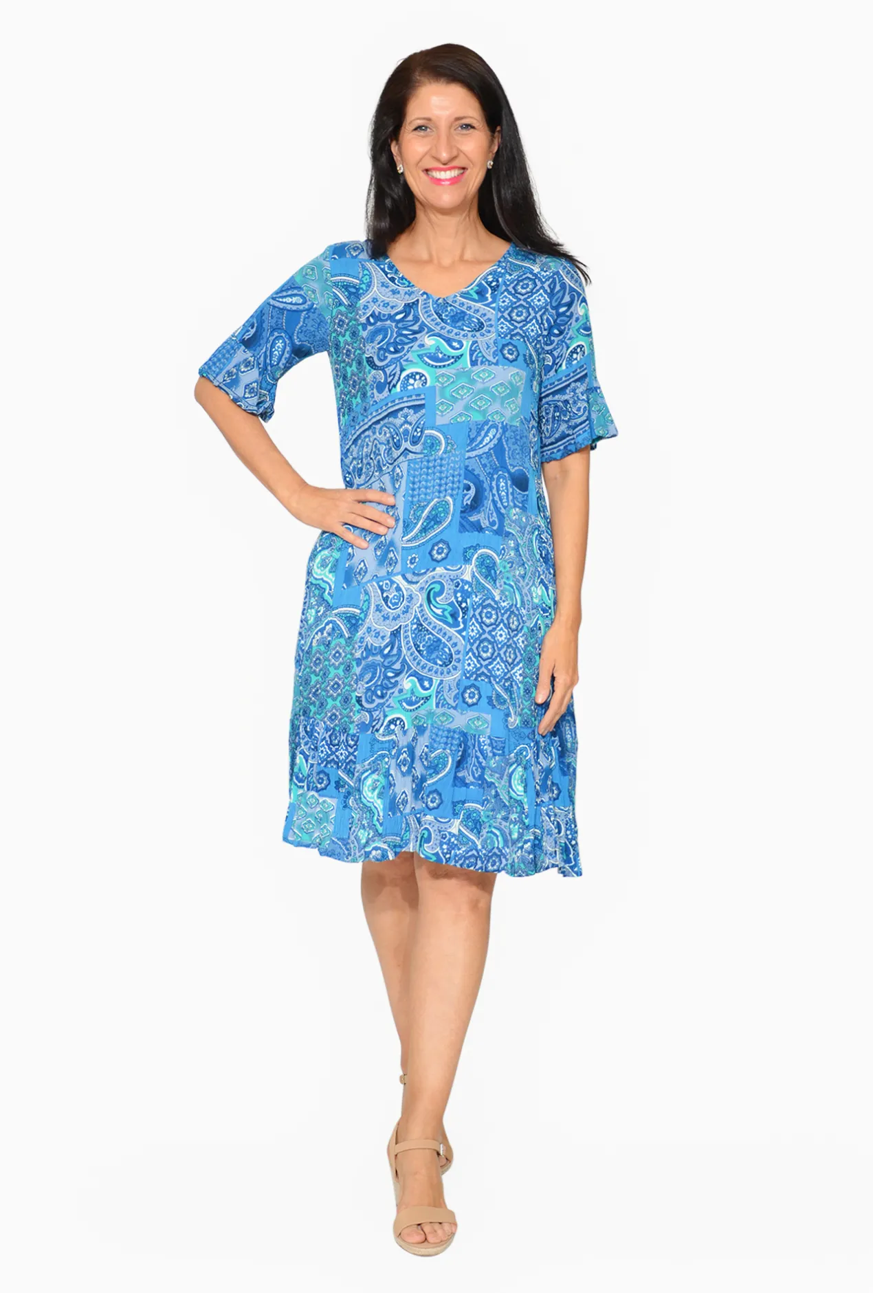 Add a touch of summer fun into your wardrobe this season with the Harley Rayon Short Sleeve Dress in Paisley Blue!