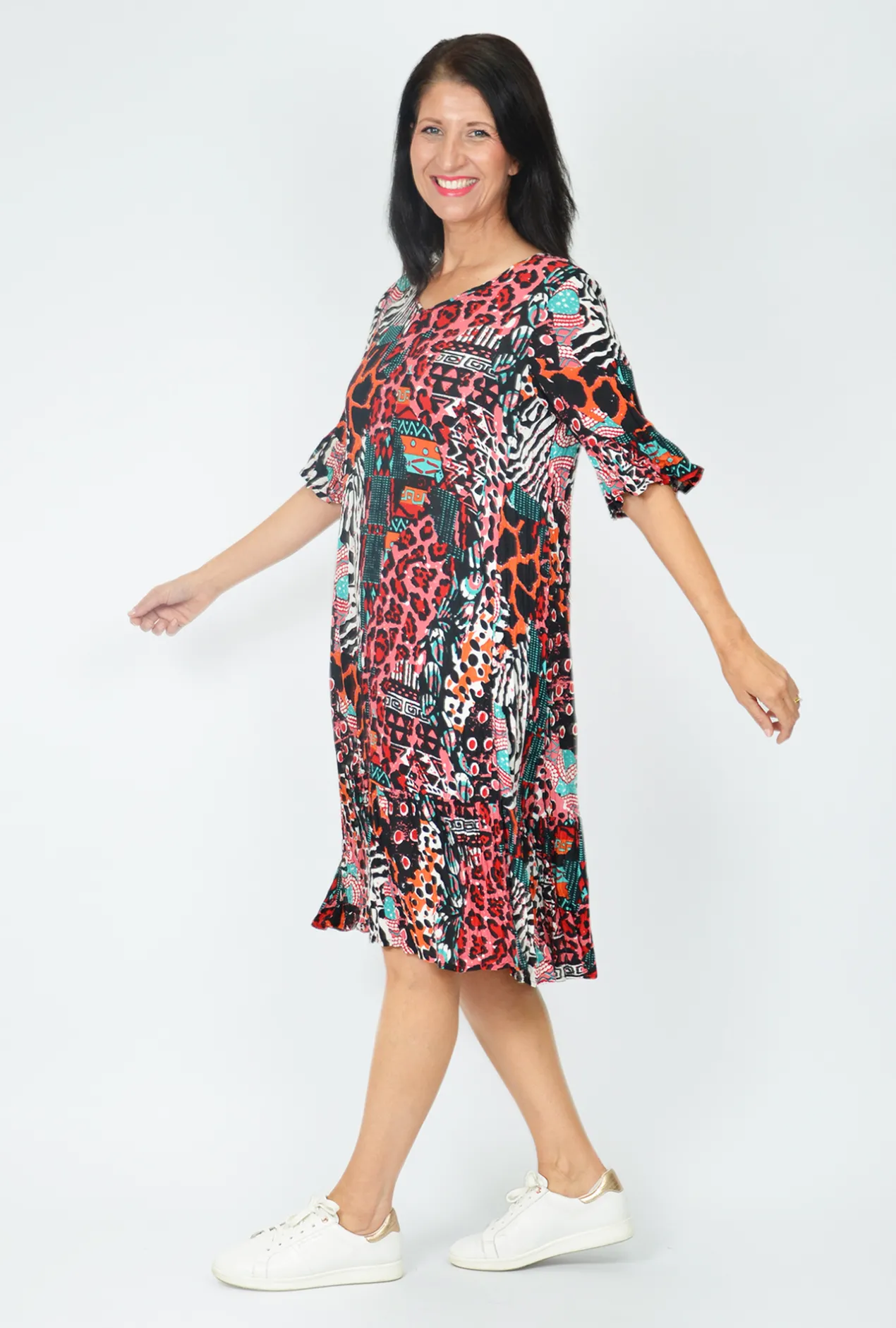 Embracing the wild side, the dress showcases an exotic animal print in shades of red, teal, pink, orange, and black. The vibrant colours intertwine seamlessly, creating a mesmerising pattern that is both eye-catching and unique. This distinctive print allows you to make a bold fashion statement, exuding confidence and individuality with every step you take.