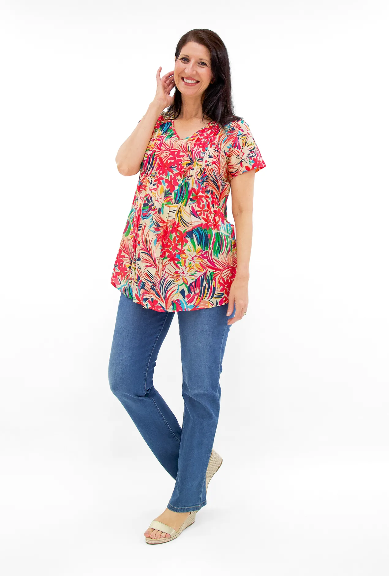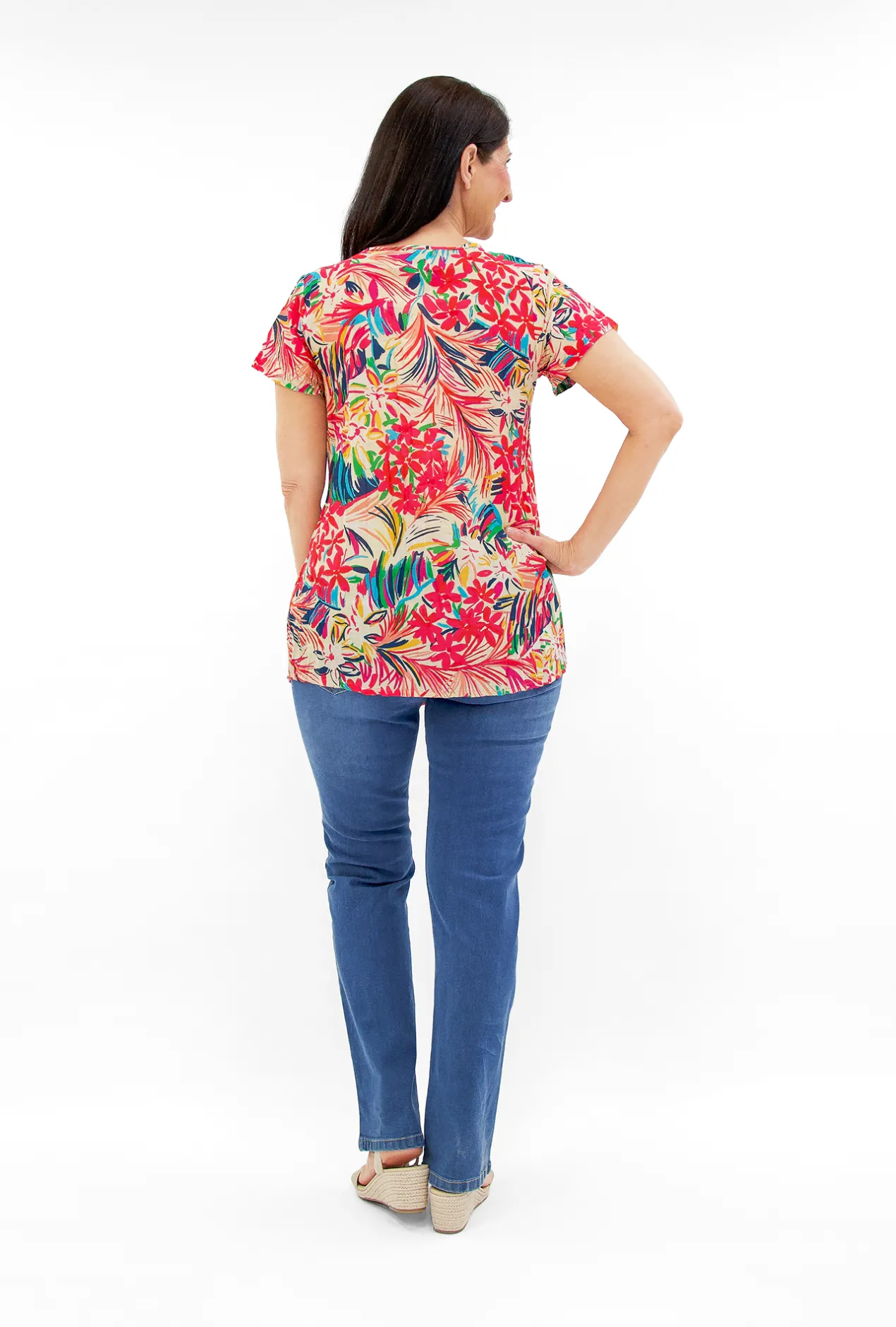 Introducing the Maggie Crinkle Cotton T-Shirt in Hot Pink Multi, a delightful blend of timeless style and captivating colours.
