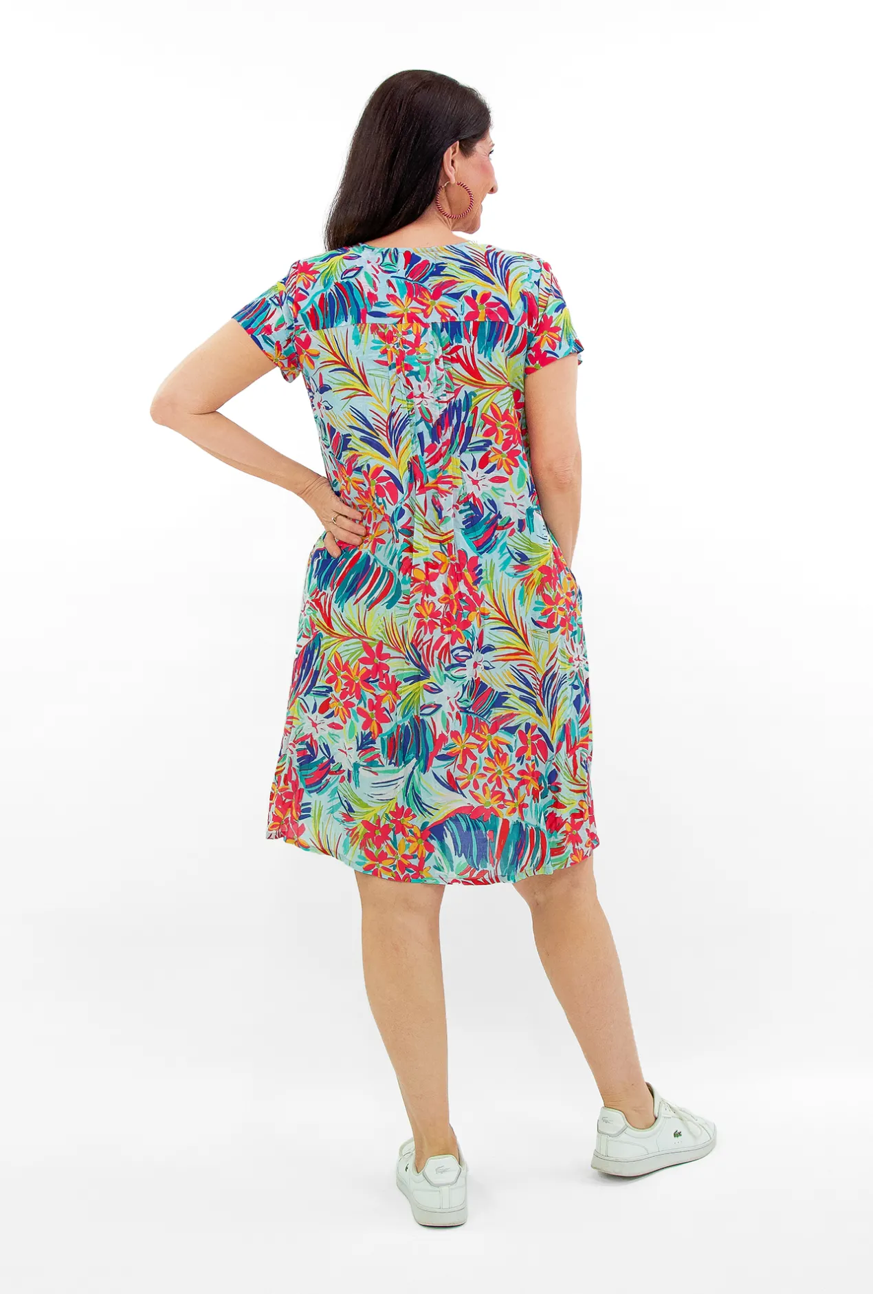 Fun, fresh and fabulous! Are the words we would use to describe the Marla Cotton Short Sleeve Cap Dress in Mid Pink Multi.