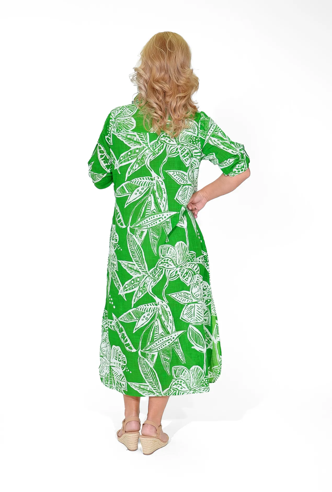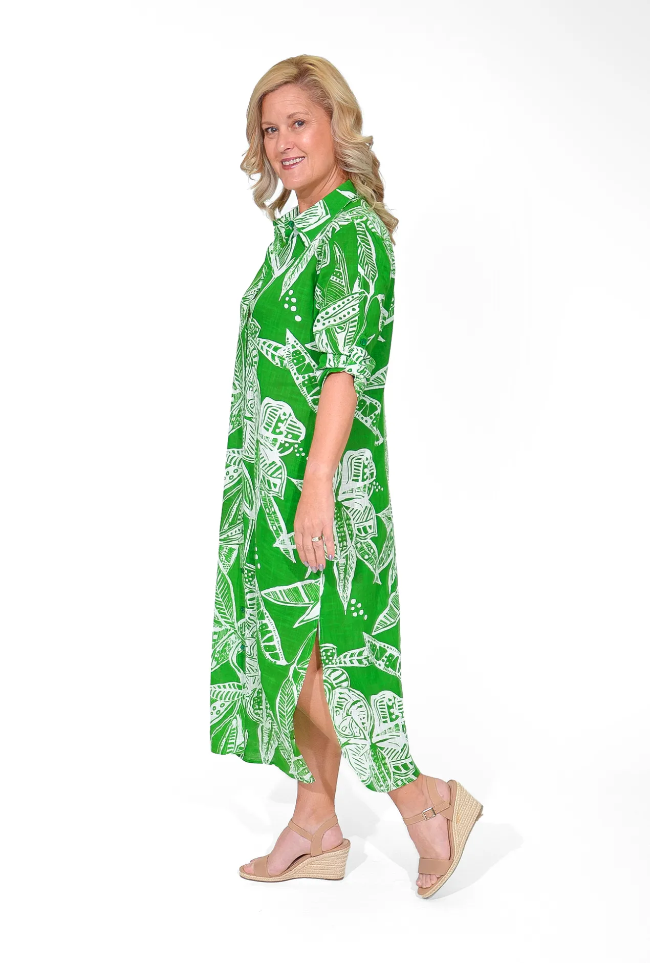 Add a pop of bright green fun into your wardrobe with our Megan Cotton Shirt Midi Dress in Green Tropics!