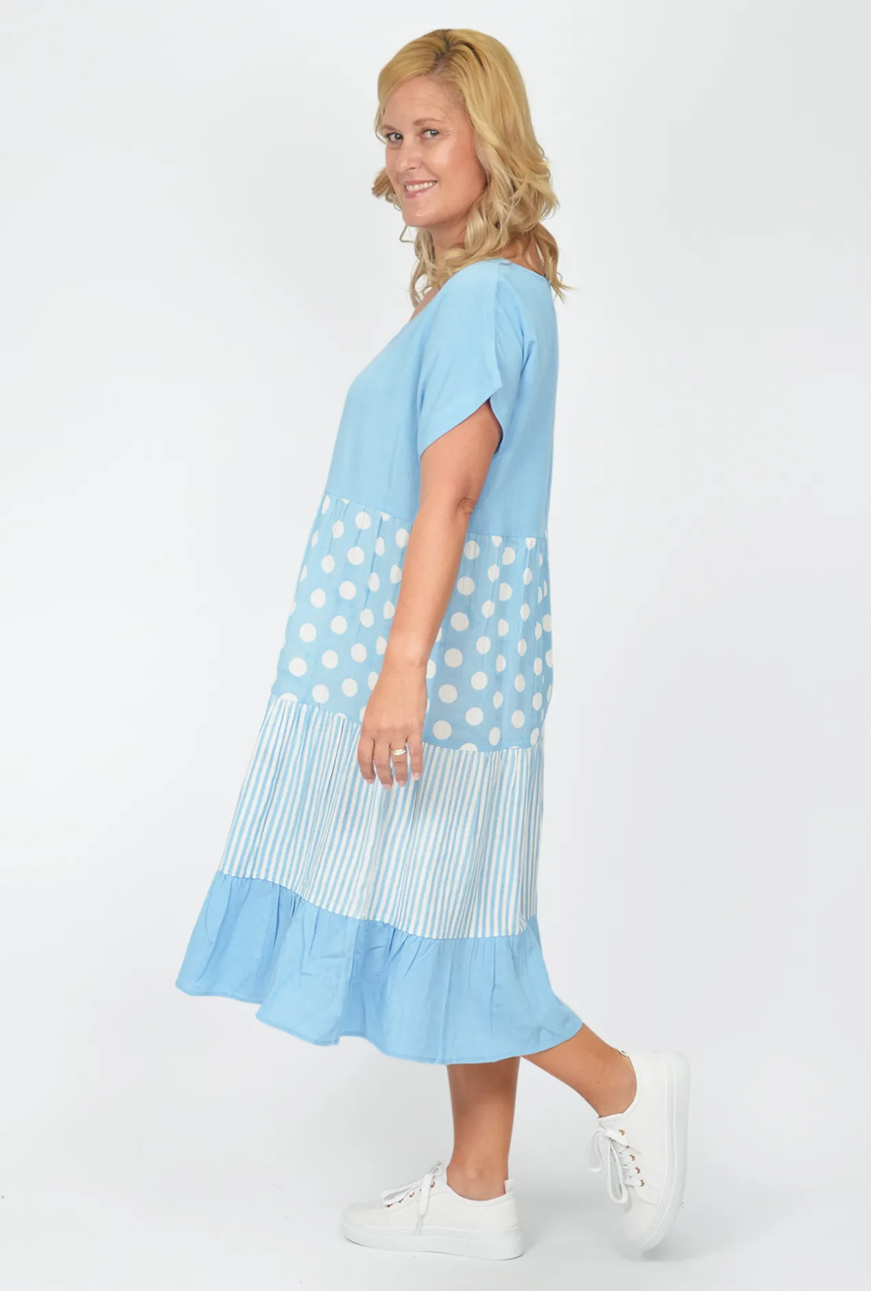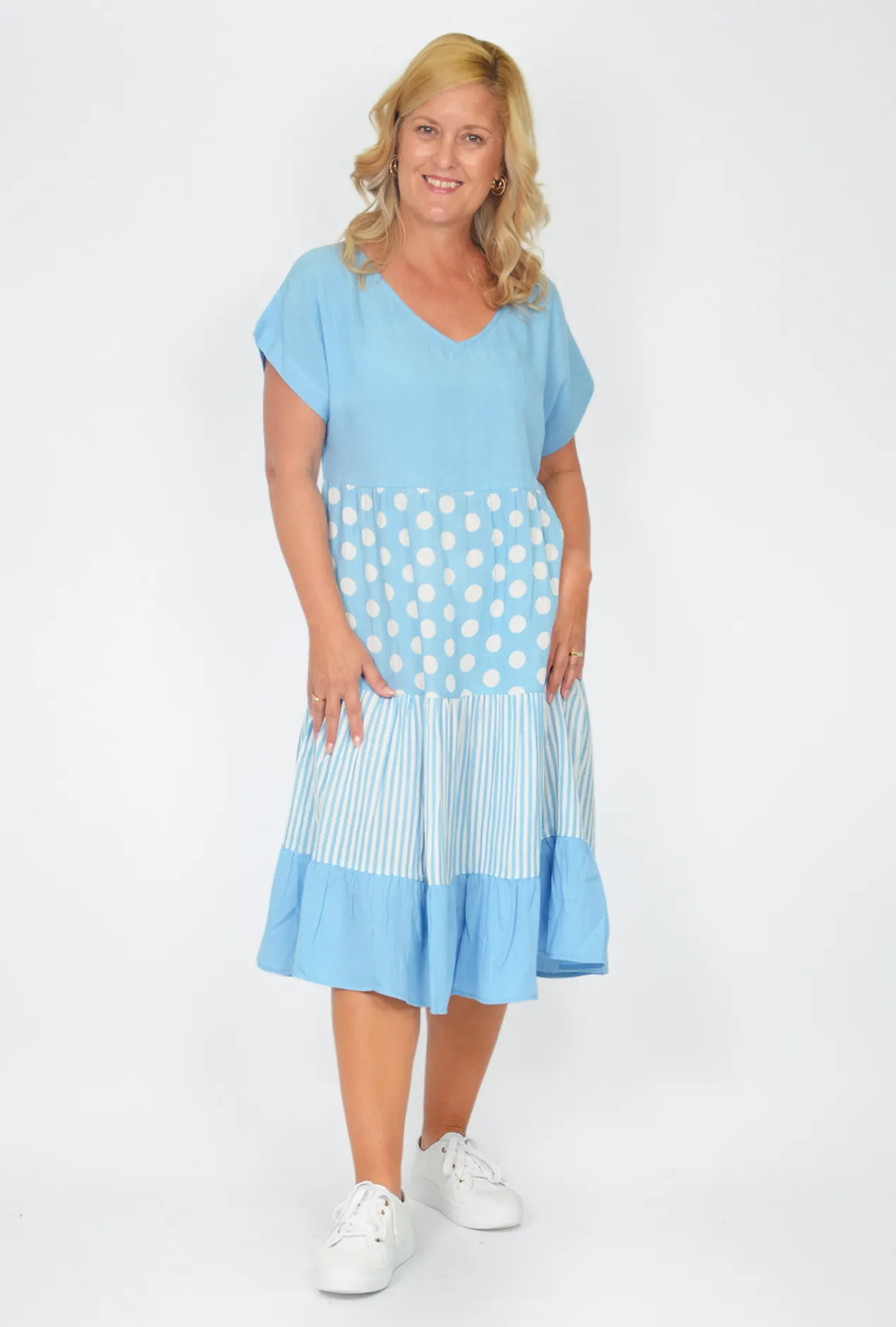 - Sky Blue color in a polka dots and vertical stripe print