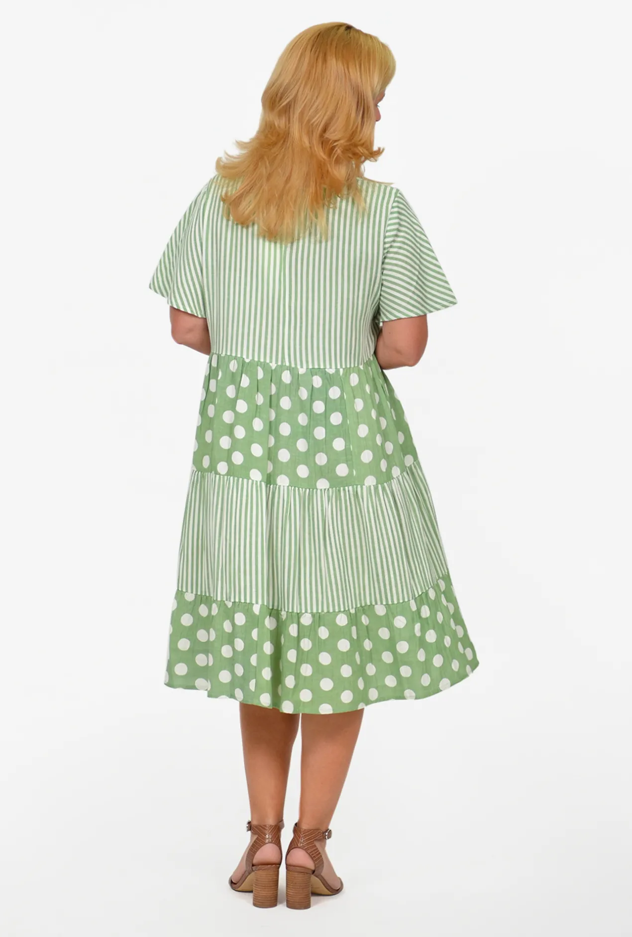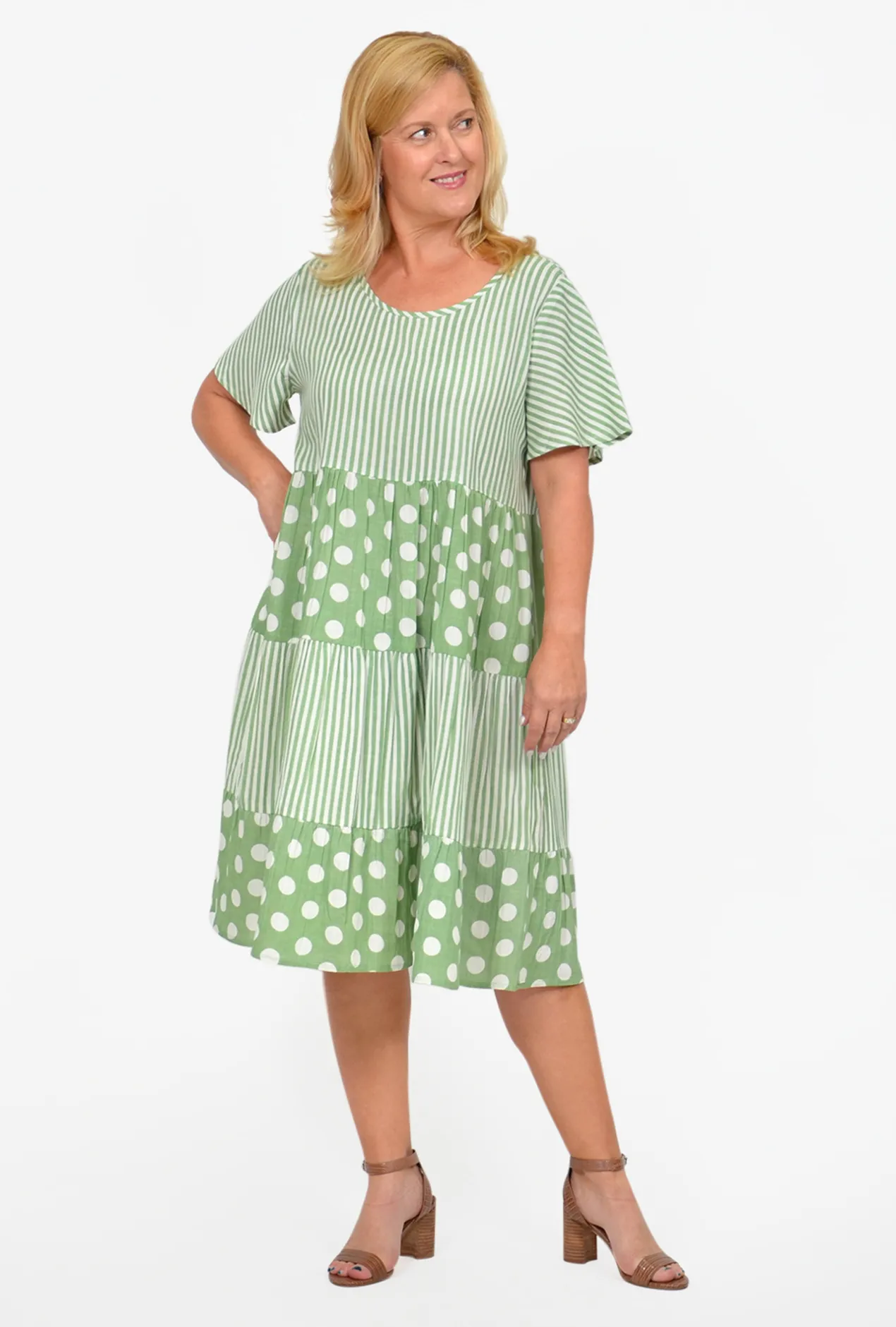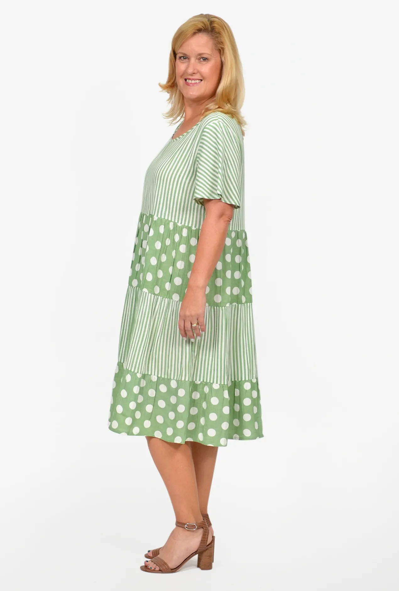 The incomparable, best-selling Rachel Tiered Smock Dress is back! Now in a seasonal Sage stripe and large spot combo. Made of a soft natural fibre blend of linen, rayon and cotton with short sleeves, a flowy tiered smock silhouette and a v-neckline, this dress makes a hot Australian Summer’s day bearable- even comfortable! We recommend going down a size as it is a generous cut. However, if you have a bigger bust, stick to your true size. Perfect to slip on over your cozzies to and from the beach or simple war out in the gardens.