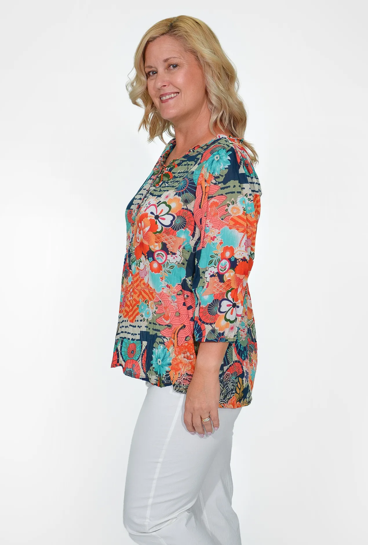 This vibrant top features bold prints and a flattering v-neckline, bringing a playful touch to any outfit. Designed with three-quarter sleeves, it offers both style and comfort, making it perfect for everyday wear. Brighten up your look with this fun and versatile blouse, a must-have addition to your collection.