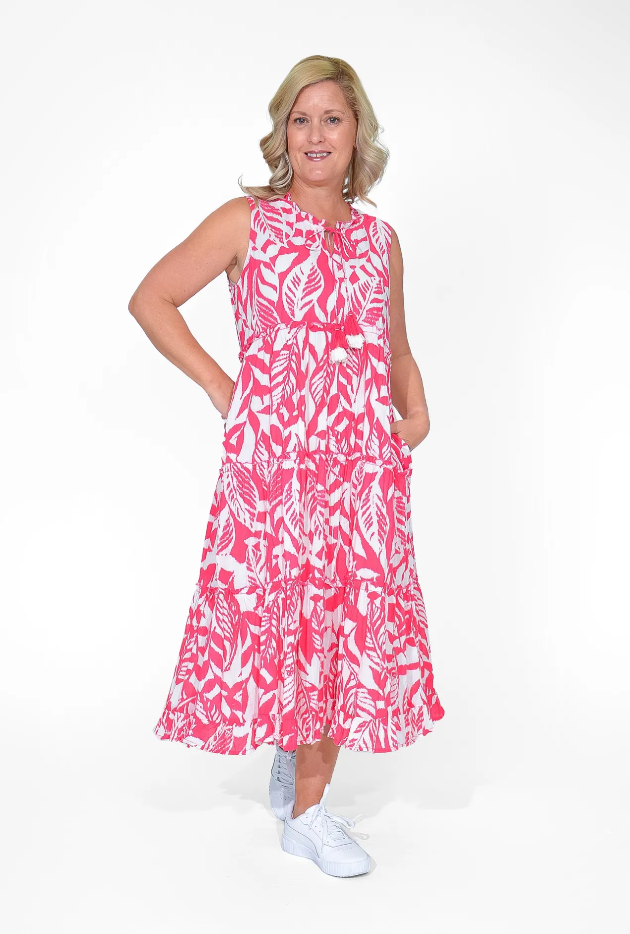 Brighten up your summer wardrobe with the vibrant Brodie Organic Cotton Sleeveless Dress in Pink.