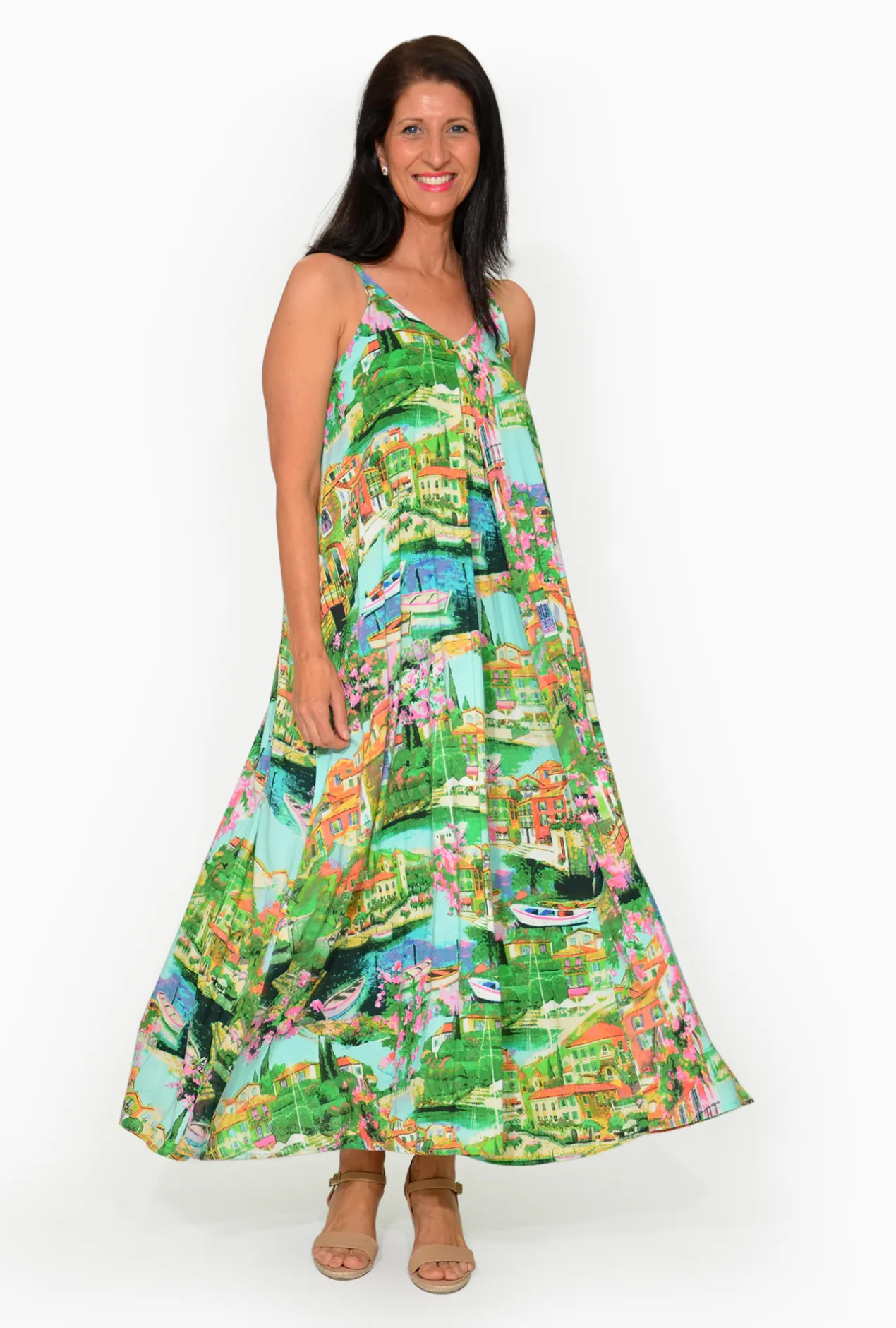 This sleeveless dress features stunning colors and delicate straps, with a relaxed fit that drapes effortlessly over your body. Ideal for sunny days and beach holidays, its flowing silhouette and lightweight fabric keep you cool and chic all season long. Embrace the essence of summer with this beautiful, effortless piece.