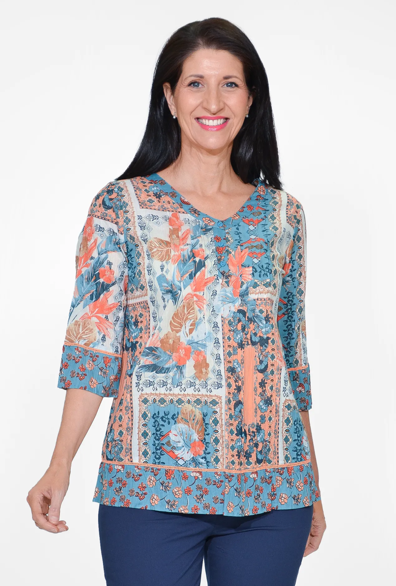 This chic tunic combines a flattering V-neckline with delicate pleats at the bust for a refined touch. The versatile 3/4 sleeves and soft, breathable fabric make it perfect for warm days and transitioning seasons. The blend of blue and peach hues adds a fresh, stylish twist to your wardrobe. Embrace the comfort and sophistication of the Davina tunic for a look that’s both relaxed and polished.