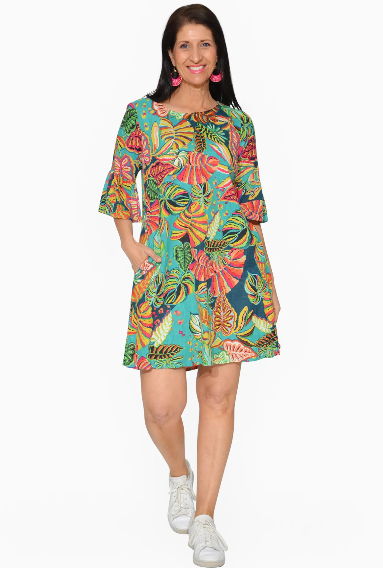 Experience effortless chic with the Diva Organic Cotton Frill Sleeve Dress in Teal Tropics.