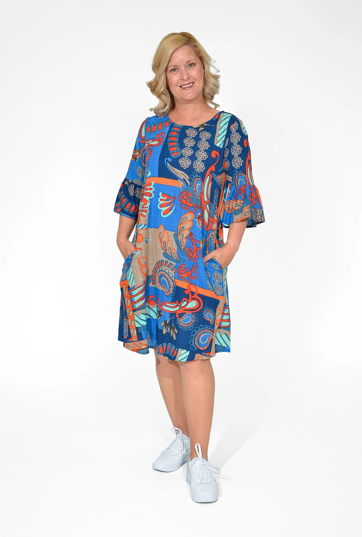 Step into summer with the captivating Diva Organic Cotton Frill Sleeve Dress in Blue Motifs.