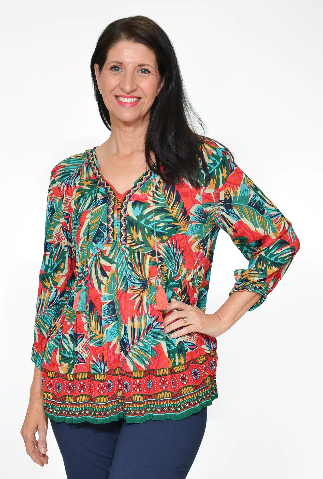 Add a splash of colour to your wardrobe with the Janelle Rayon 3/4 Sleeve Boho Blouse in Red & Green Tropics.