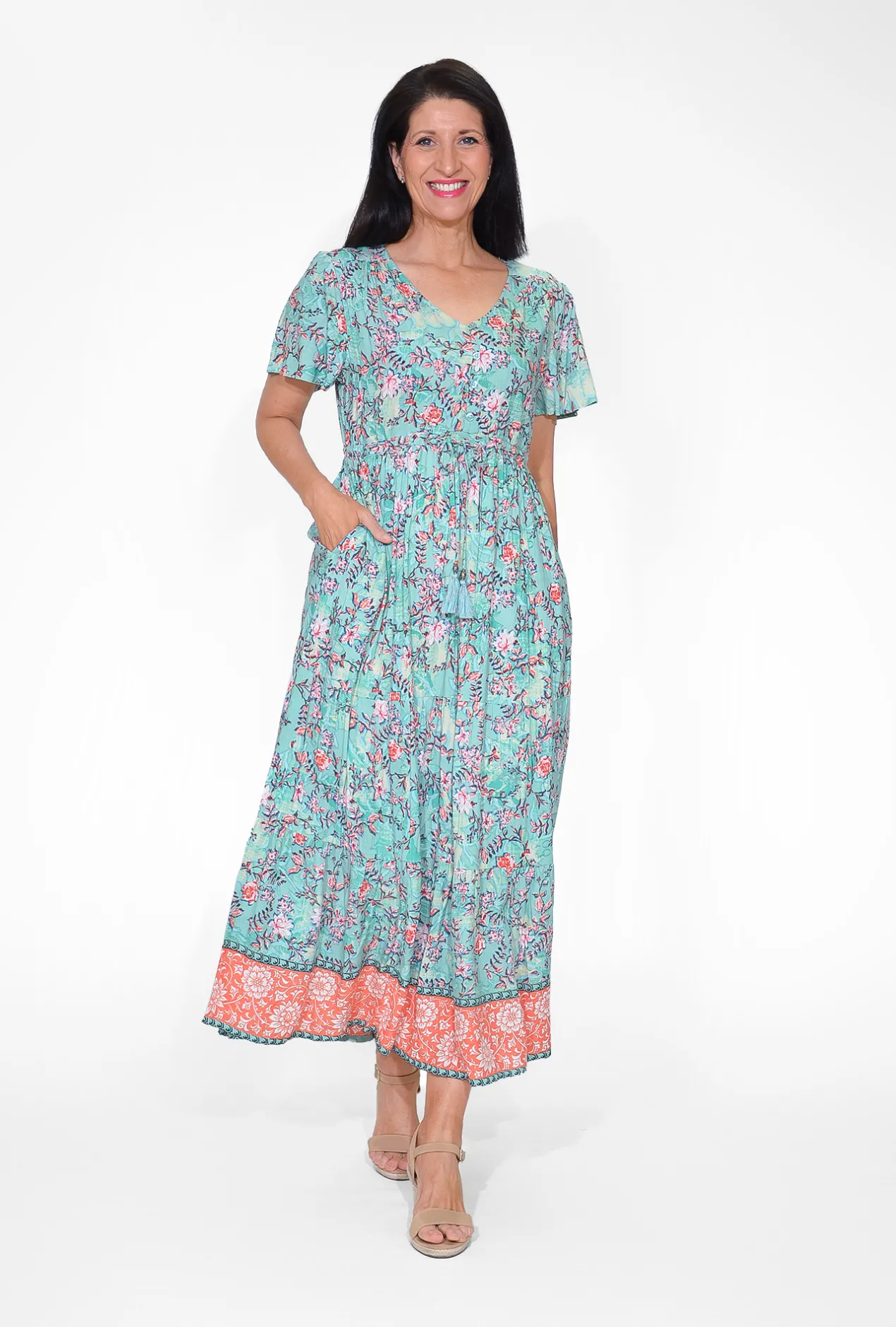 This beautiful dress features a serene sage green hue, buttons at the bust, and short sleeves, creating a perfect blend of style and comfort. The flowing maxi length offers a graceful silhouette, making it ideal for sunny days and beach holidays. Elevate your summer wardrobe with this must-have dress, designed for effortless style and ease.