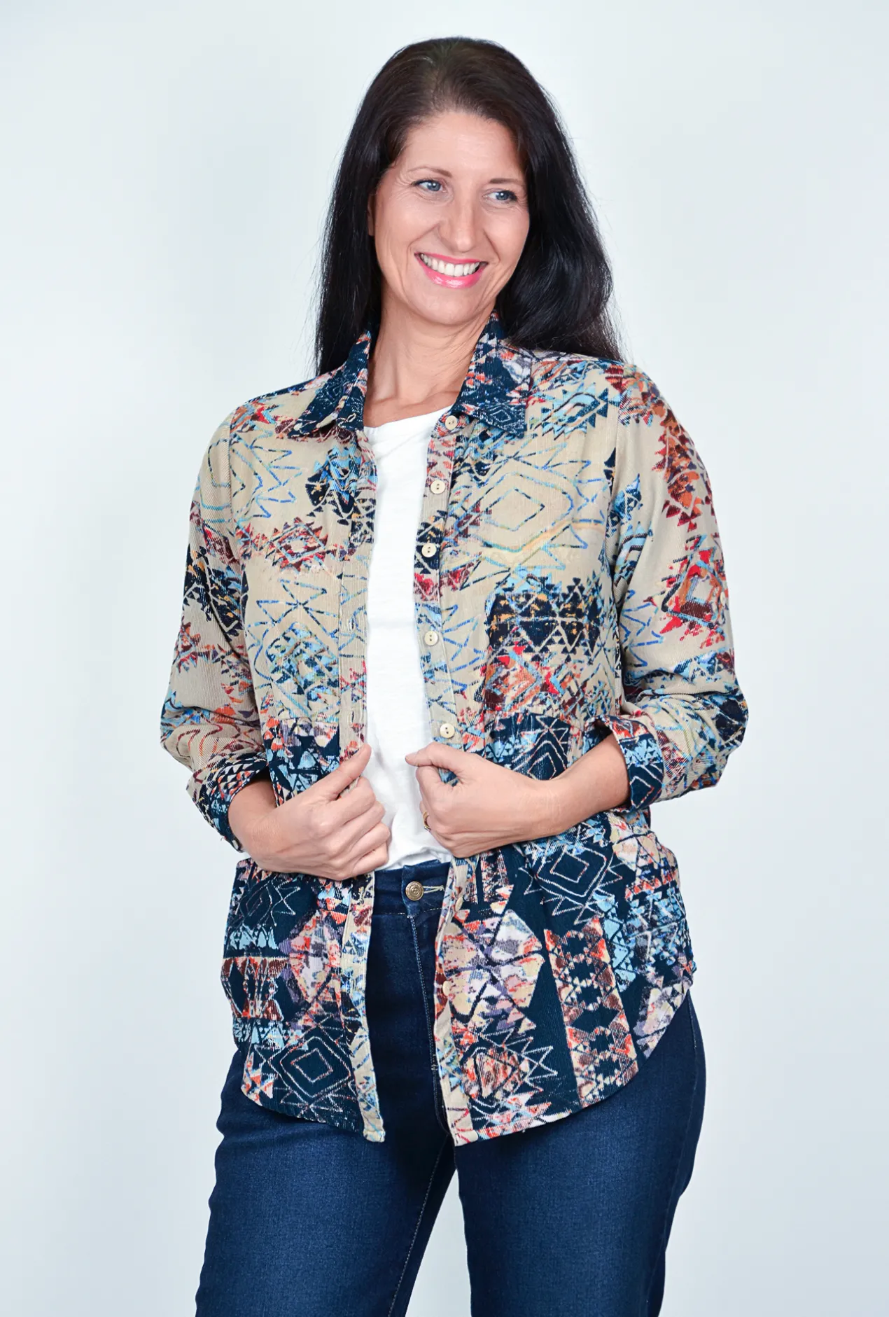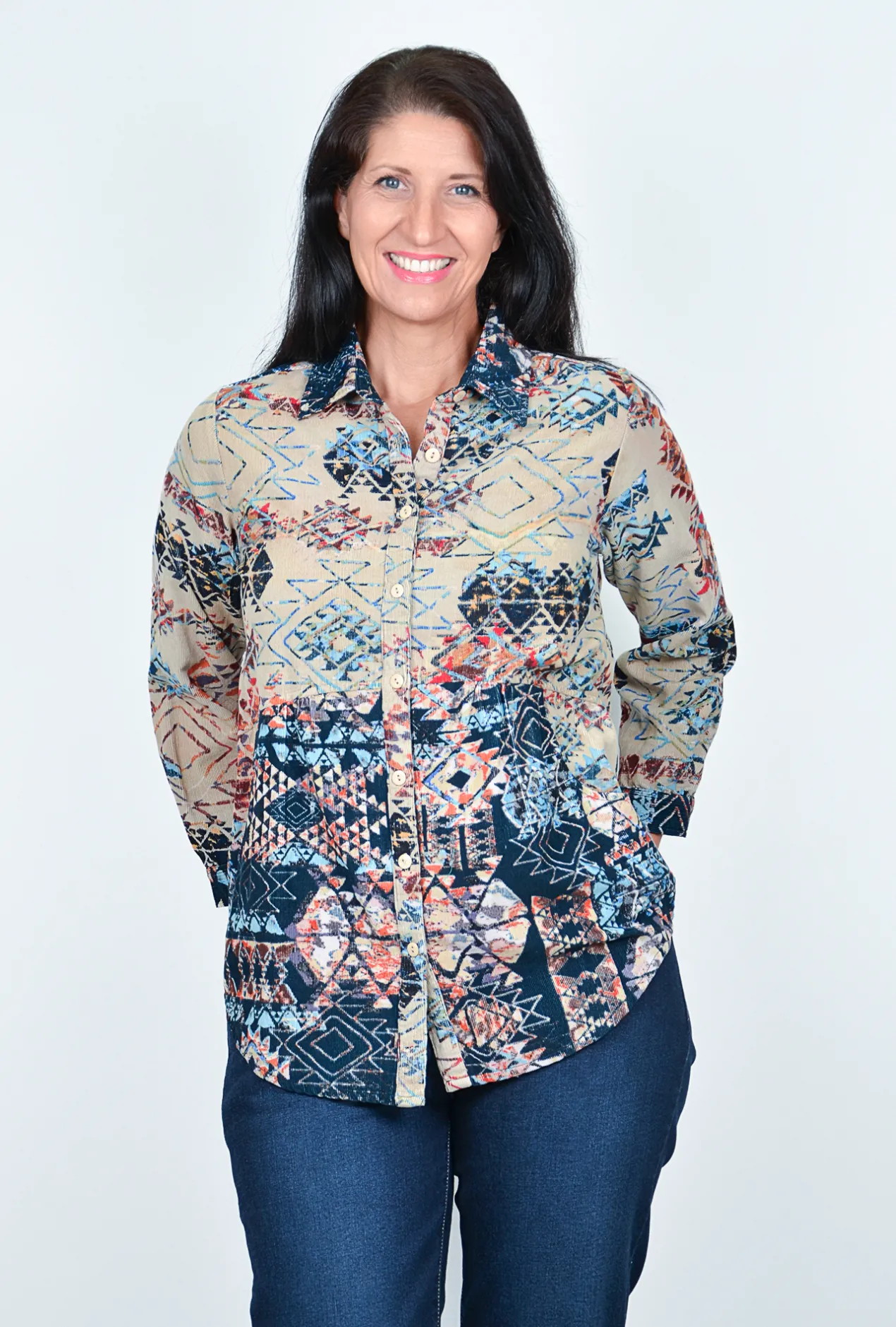 - Blue and cream with geometric print