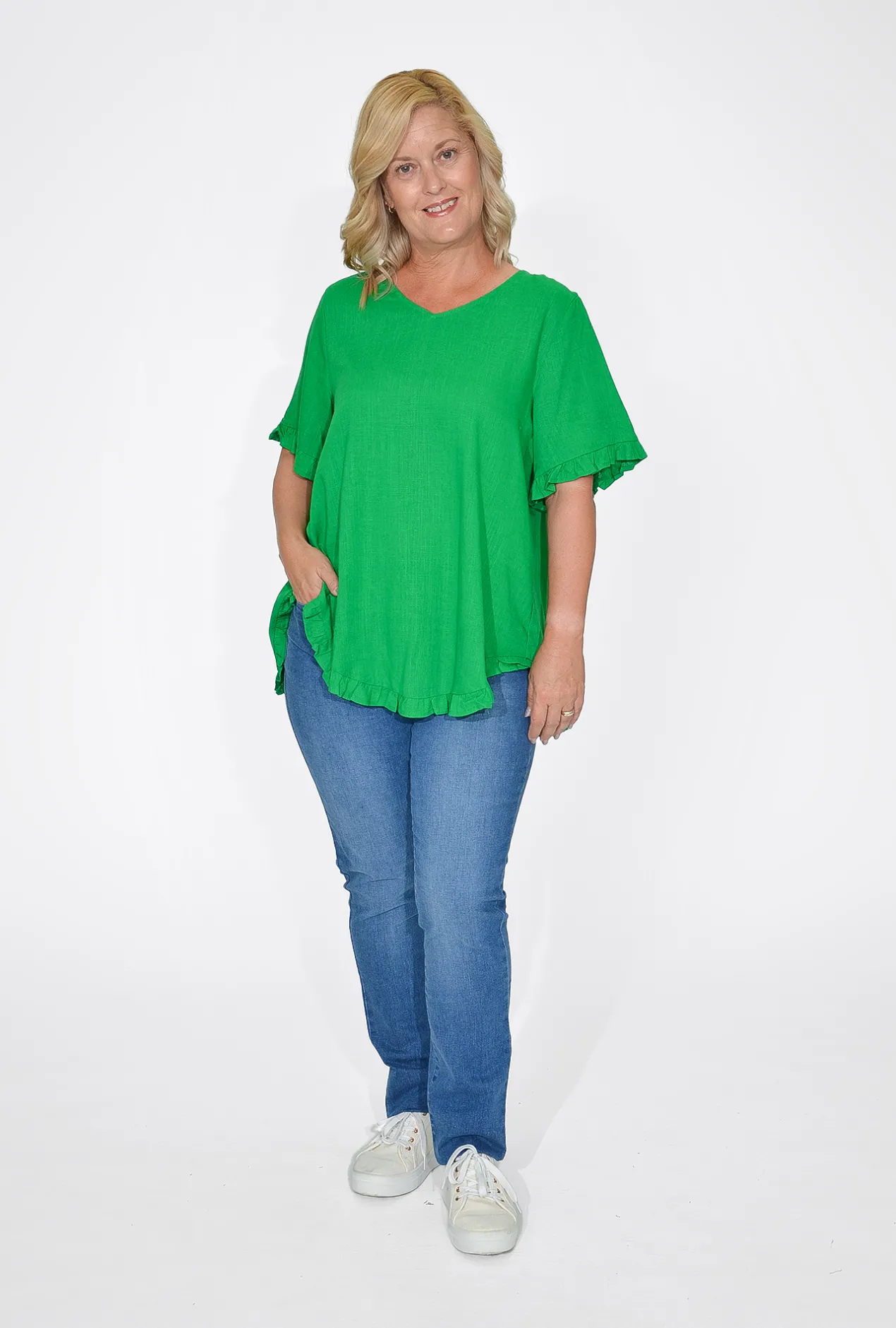 Feelin’ fab in our Brooklyn Frill Sleeve Button Back Top in Green!