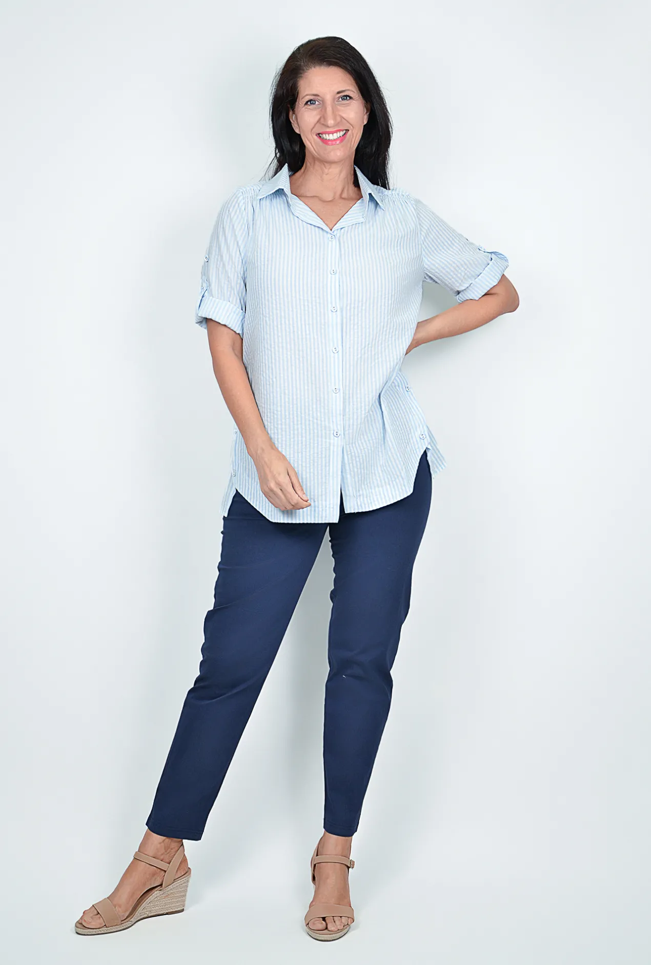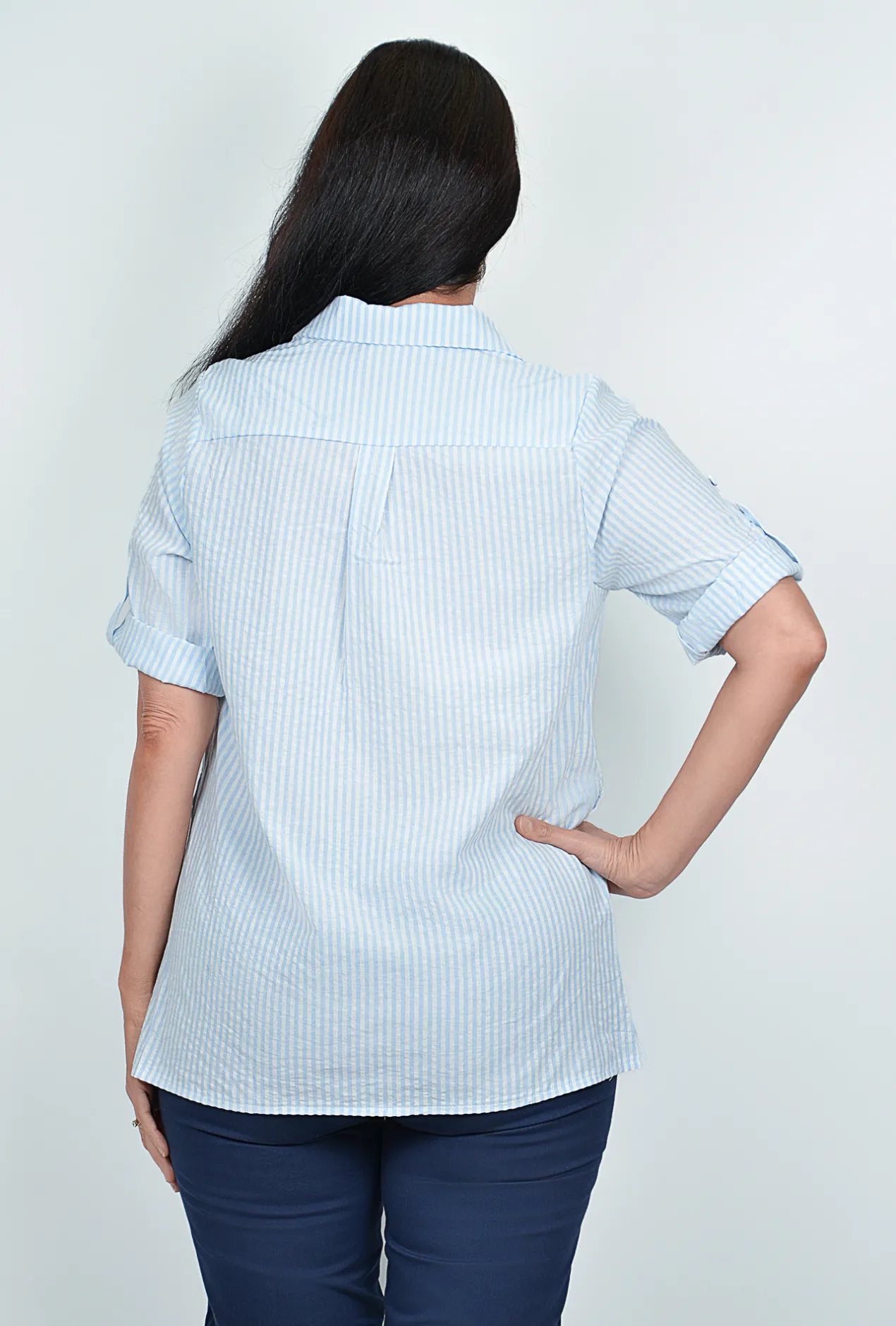 Meet the Ophelia Cotton Button Up Blouse in Blue Stripe, a stylish addition to your wardrobe!