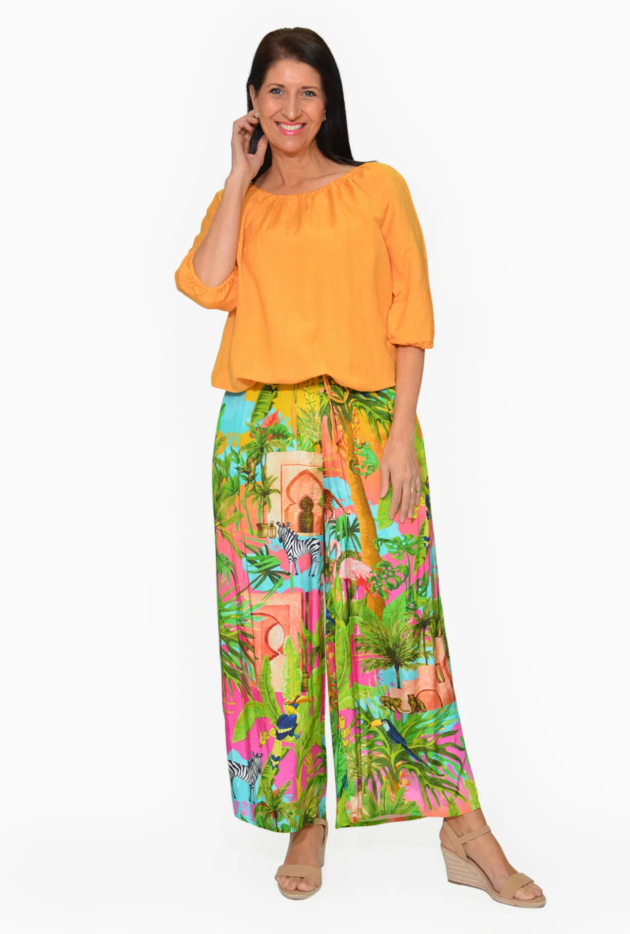 This timeless piece boasts a chic gathered neckline that can be styled both on or off the shoulders for a versatile look. The drawstring hem adds a playful touch, letting you adjust the fit and flair to your liking. Whether you pair it with our matching linen pants for a coordinated ensemble or mix and match with our stunning printed bottoms, this top effortlessly combines comfort and style for any occasion.