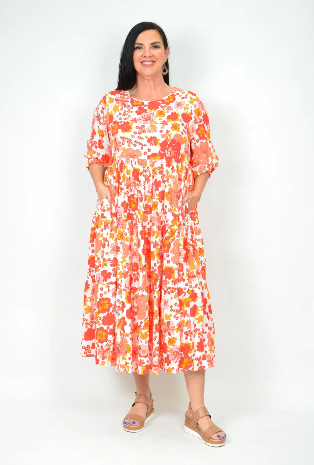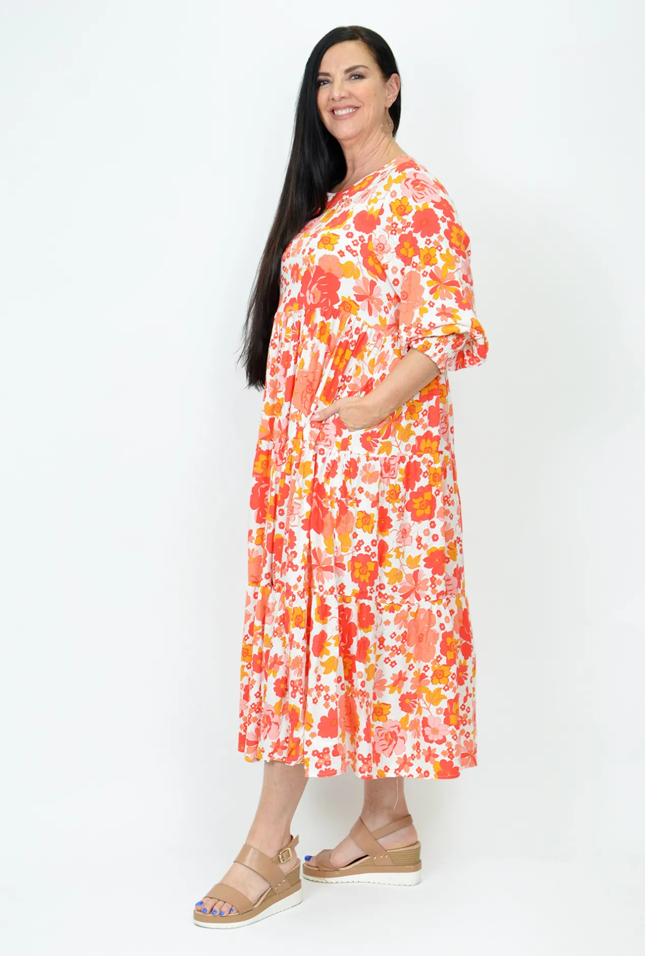 Our new Tina Midi dress in the eye catching Flower show print is sure to turn heads! We love this 3/4 sleeve dress with elastic cuffs and midi length. The baby doll style is a classic and the Rayon fabric is beautifully light weight and easy to care for. Available is sizes 8-18, we’re sure this will be a favourite of your this season.