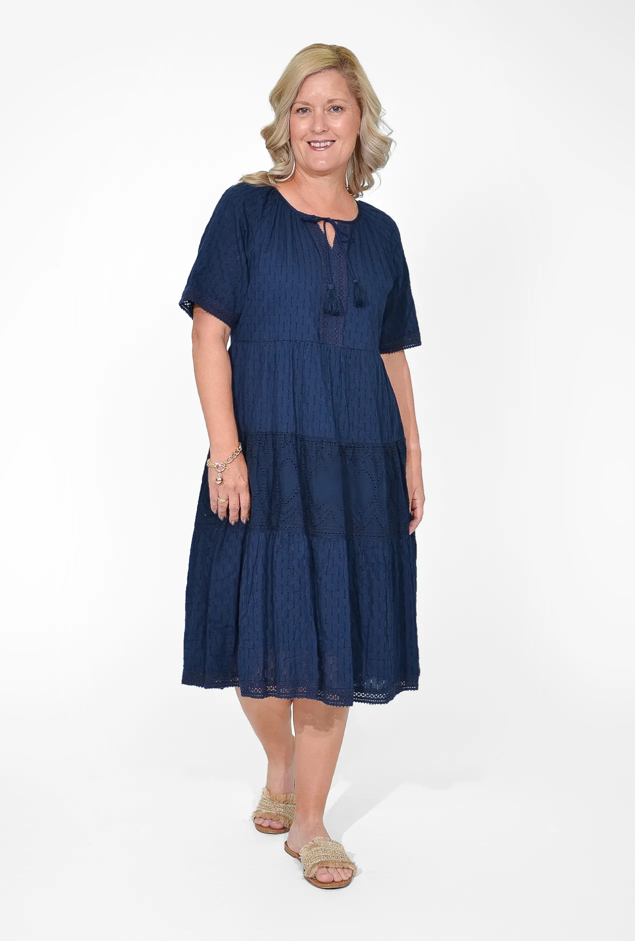 Designed with a flattering V-neckline and charming tassel details, this dress features delicate Emma accents that add a touch of sophistication. The gathered tiered skirt brings a playful yet refined look, making it an ideal choice for any summer occasion. Embrace both comfort and style with this versatile and chic dress.