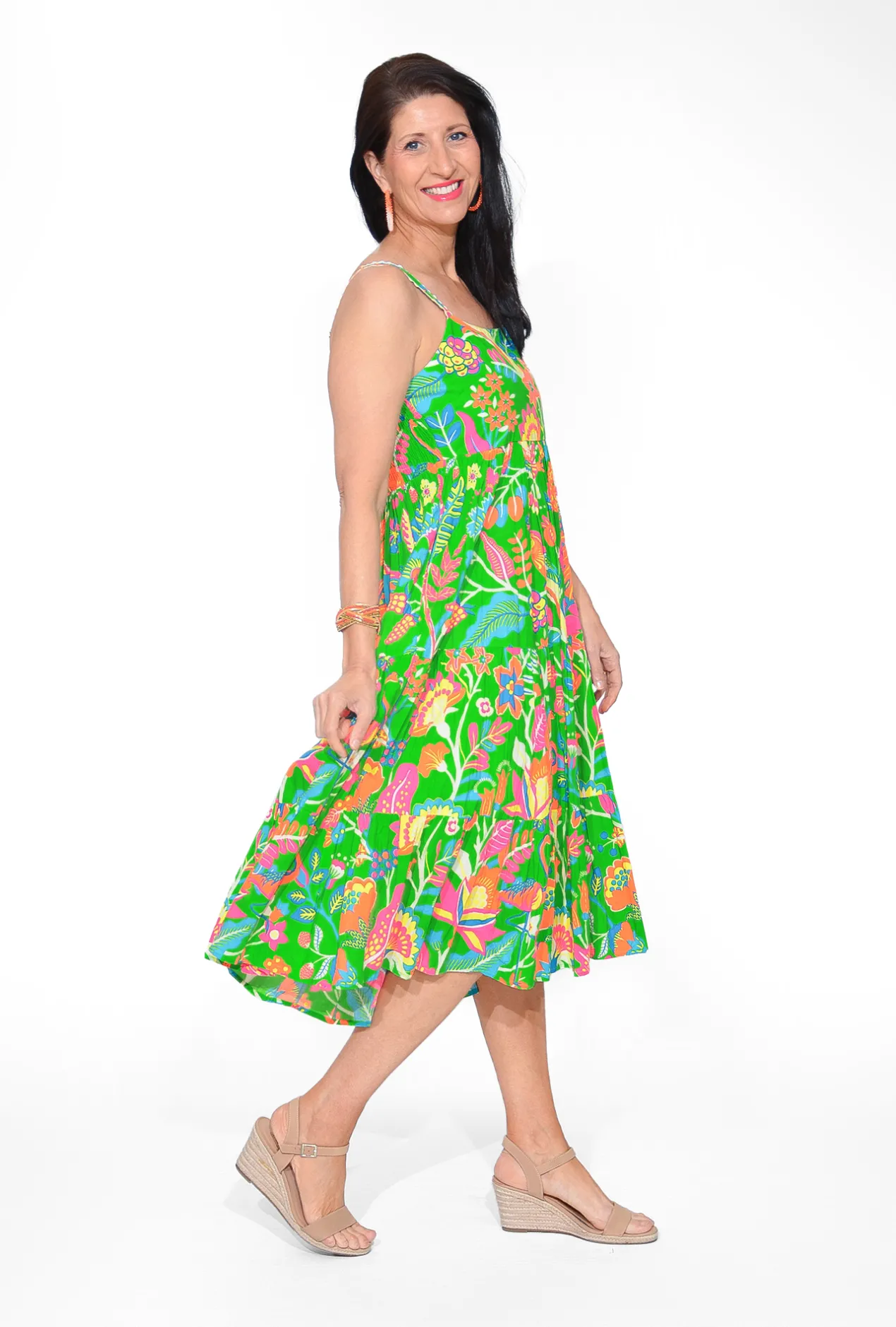 Designed with wide straps for both comfort and flair, this dress features a delicately gathered seam under the bust that flows into a breezy, flattering midi-length skirt. The lightweight organic cotton ensures breathability and ease, while the vibrant green hue adds a fresh, lively touch. Whether you’re heading to a garden party or a casual brunch, the Mikaela dress offers a chic and effortlessly elegant look perfect for sunny days and warm evenings.