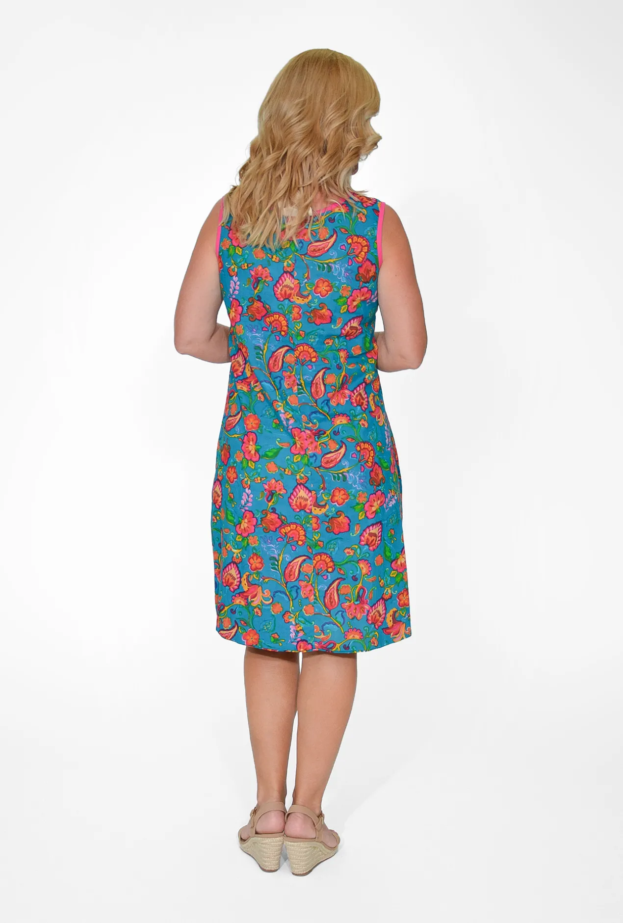 Introducing the Peta Reversible Organic Cotton Shift Dress in Teal Multi – Two stunning looks for the price of one!